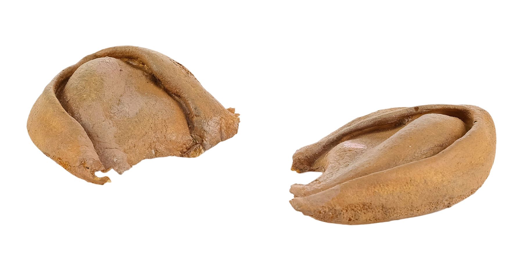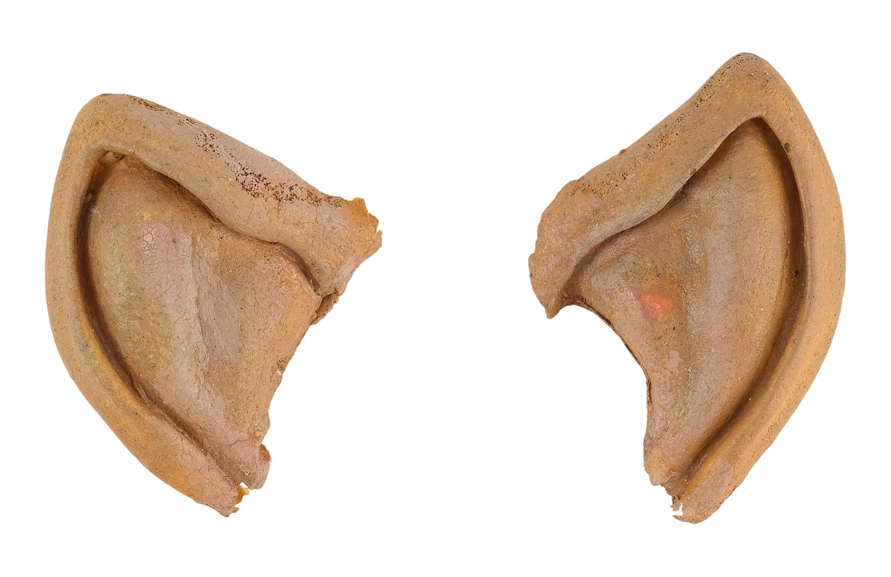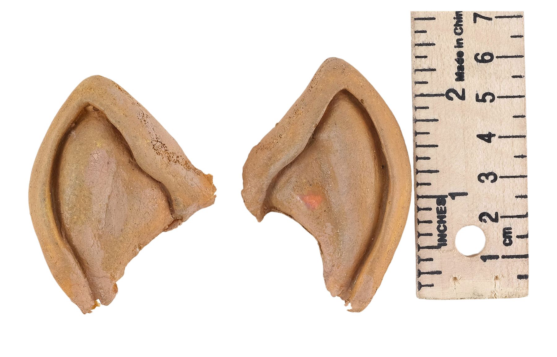 This lot, originally procured from a member of Lenard's family, consists of a pair of foam latex ear tip appliances painted brown with a sculpted helix ridge and a pronounced antihelix. They exhibit some discoloration and flaking from use and age. Dimensions: (each) 2" x 2.5" x 0.25" (5.25 cm x 6.5 cm x 0.75 cm)
