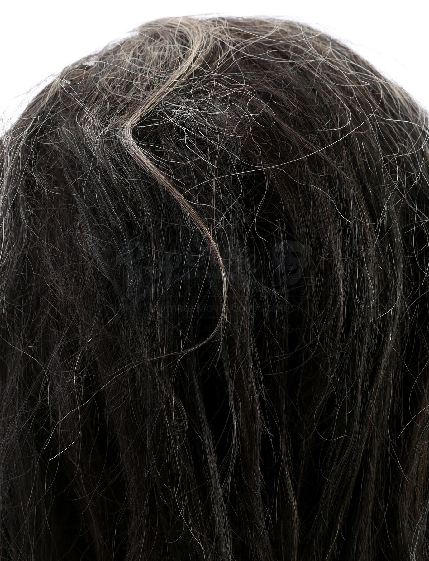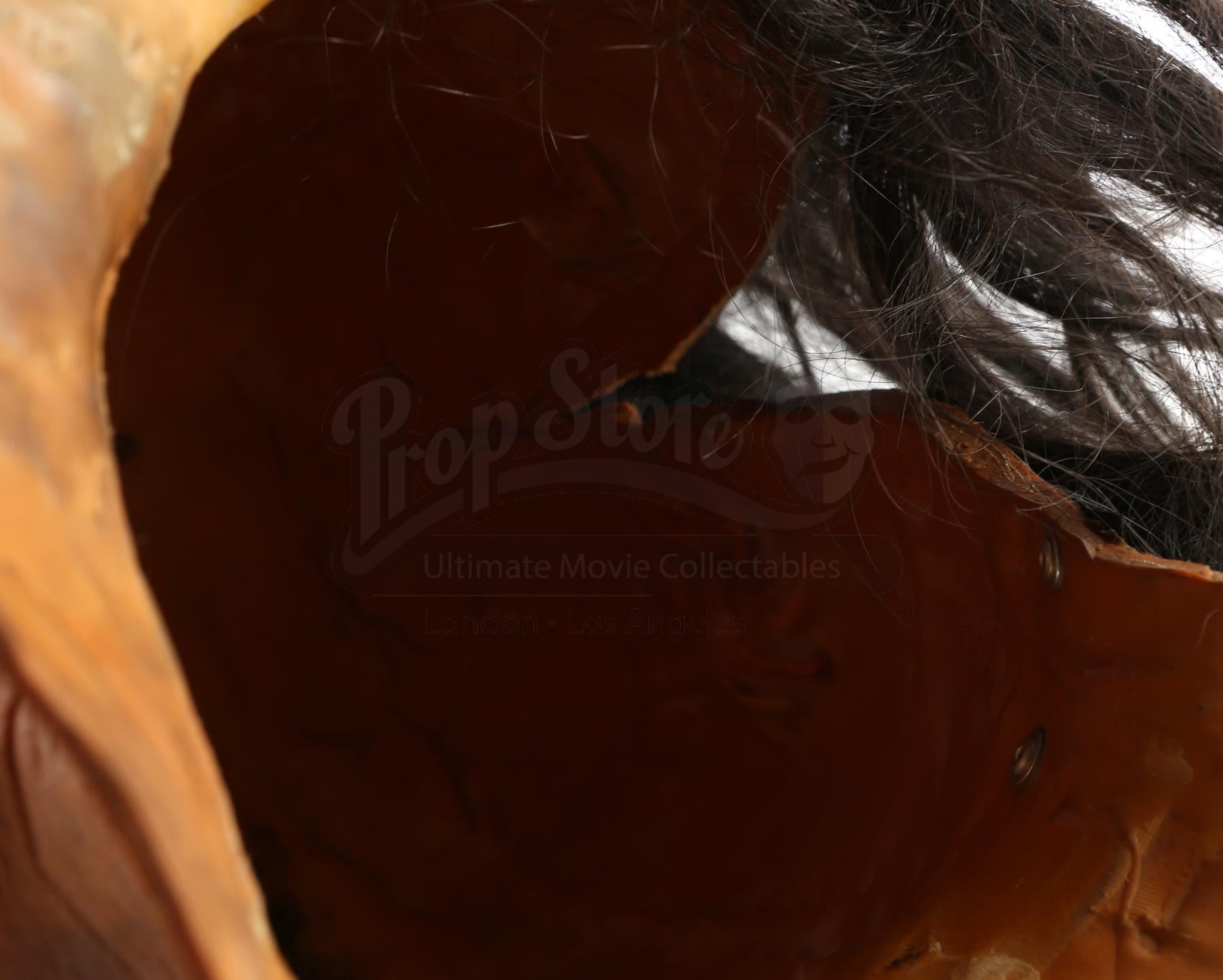 This fully detailed rubber Klingon mask featuring the classic ribbed forehead is cast in latex and features punched hair, a split down the back for easy application by the wearer, and four metal snaps at the base of the neck for wardrobe. The mask exhibits minimal wear and has some missing eyebrow hair. Dimensions: 14" x 10" x 9" (35.5 cm x 25.5 cm x 23 cm)
