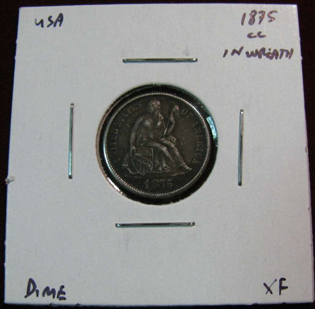 1541. 1875CC Mint Mark in Wreath Liberty Seated Dime EF.