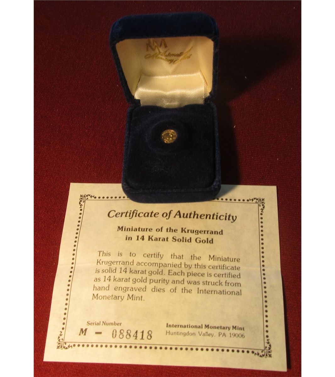 1542. Miniature of the Krugerrand in 14K Solid Gold with Certicate of Authenticity.