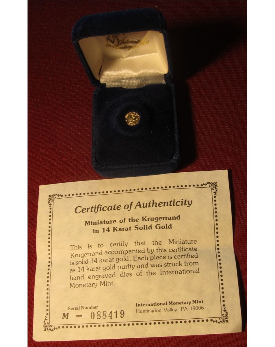 1543. Miniature of the Krugerrand in 14K Solid Gold with Certicate of Authenticity.