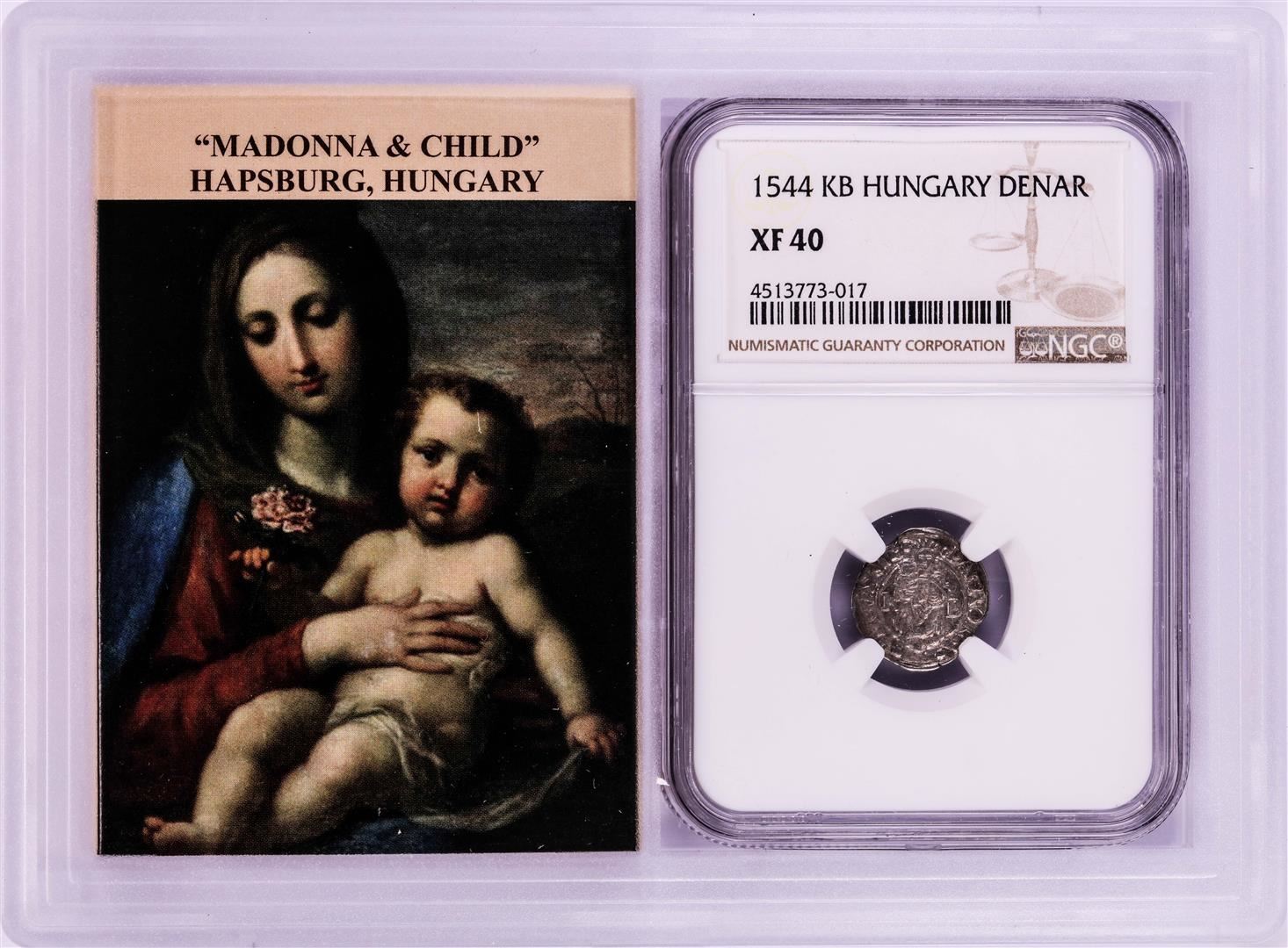 One 1544 KB Hungary Denar 'Madonna and Child' Coin NGC XF40 With Story Box. NGC Certified.