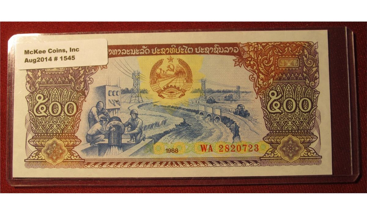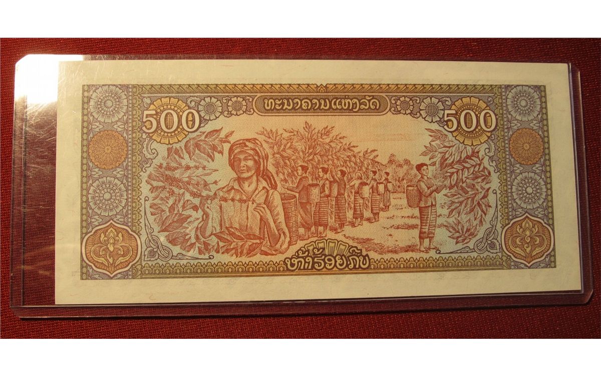 1545. 1988 State of Laos, Pathet Lao Government 500 Kip. CU. Brown and deep blue on m/c unpt. Modern