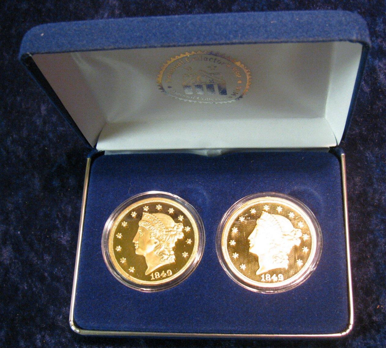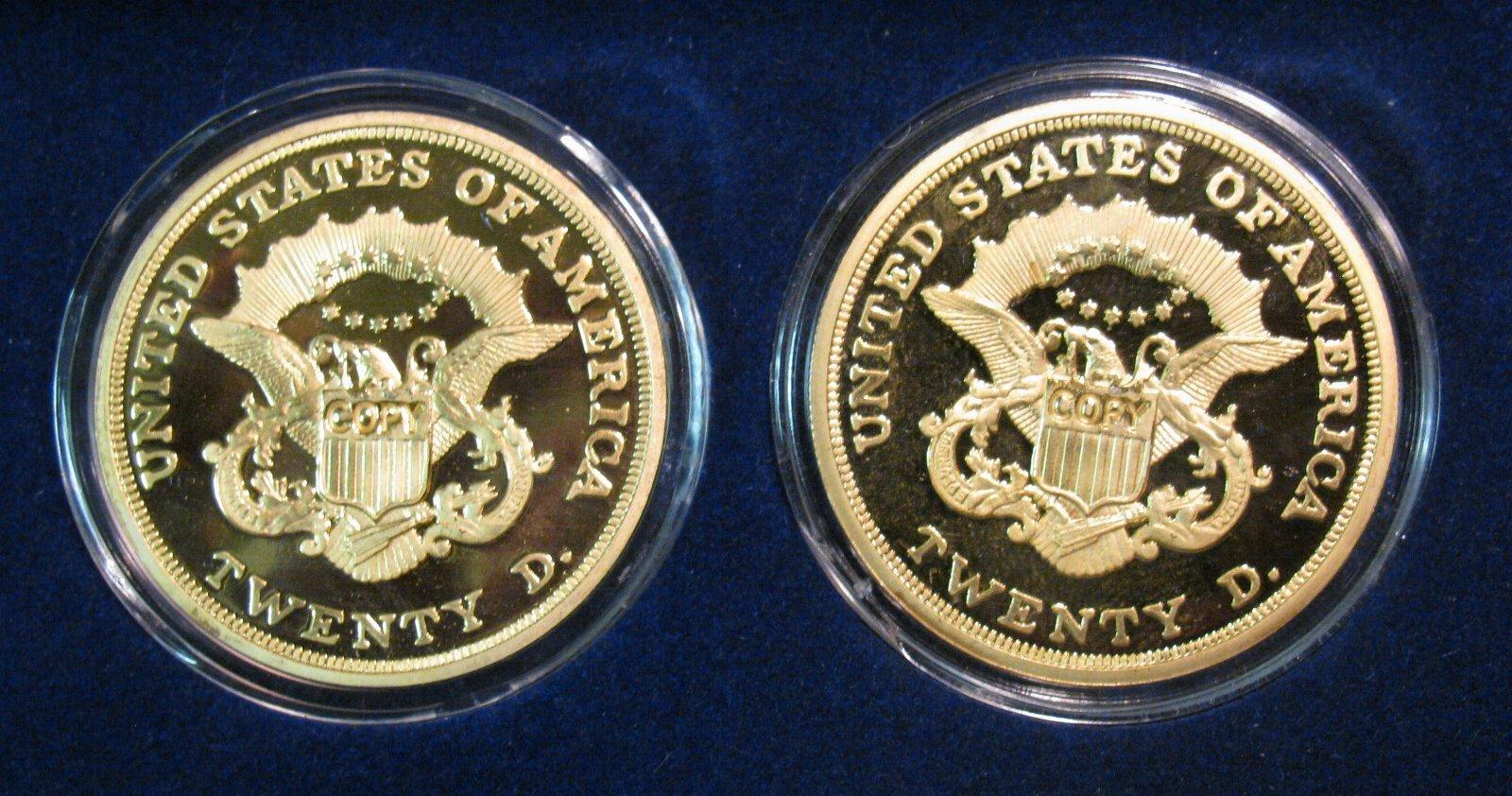 1546. 1849 Double Eagle Proof Set. One struck in One Ounce .999 fine Silver with 24K gold overlay and the second clad in 100 Mil. .999 Pure Silver with 24K Gold Overlay. Both are copies of the original $20 gold Liberty. Encased in a velvet-lined case.