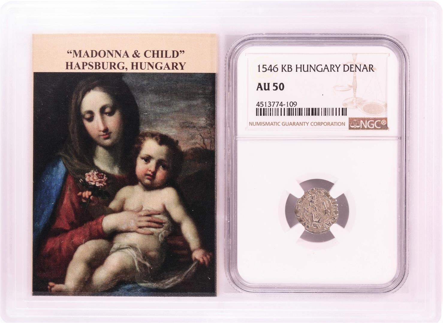 1546 KB Hungary Denar 'Madonna and Child' Coin NGC AU50 w/ Story Box