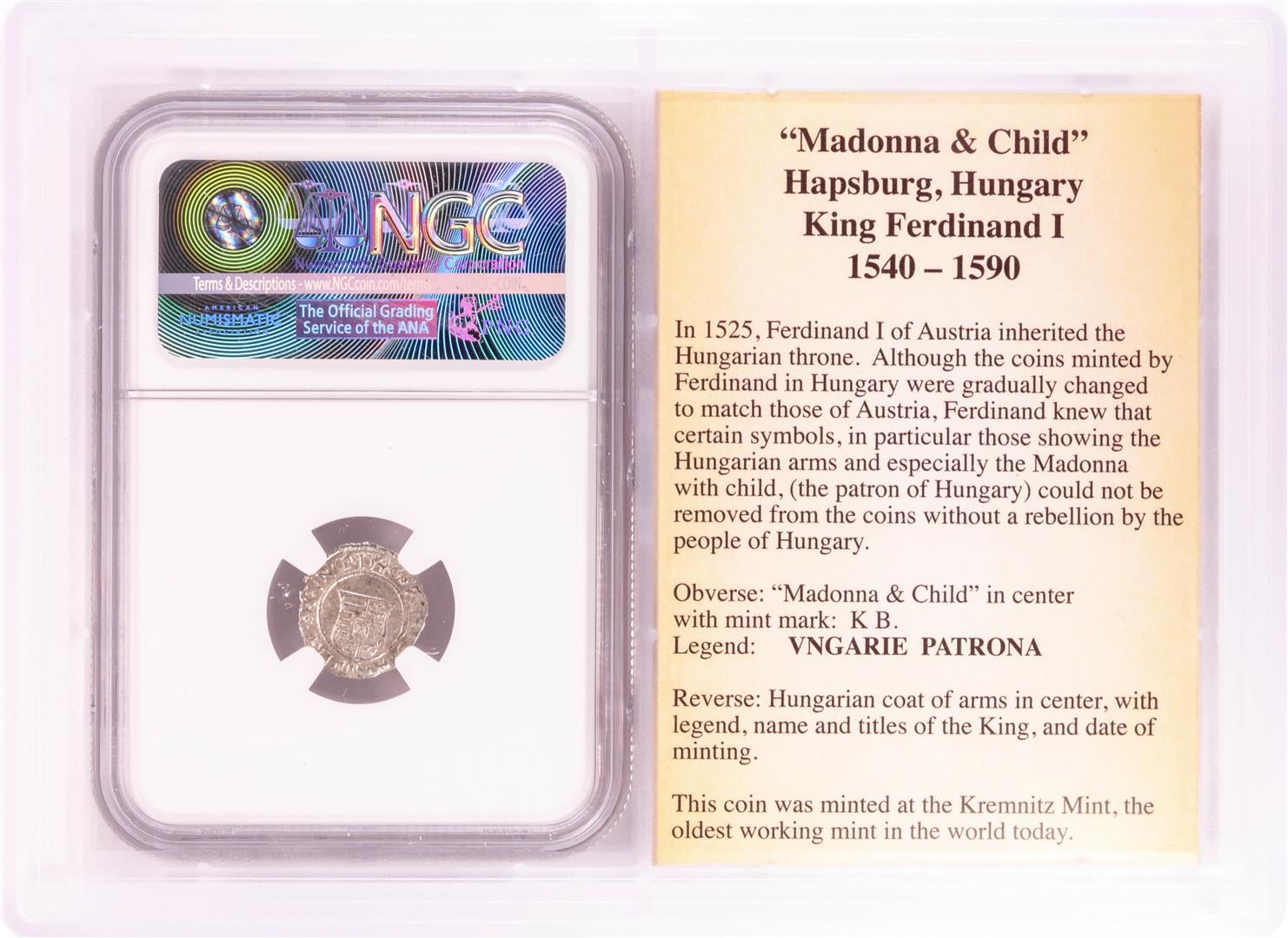 One 1546 KB Hungary Denar 'Madonna and Child' Coin NGC AU50 w/ Story Box. NGC Certified.