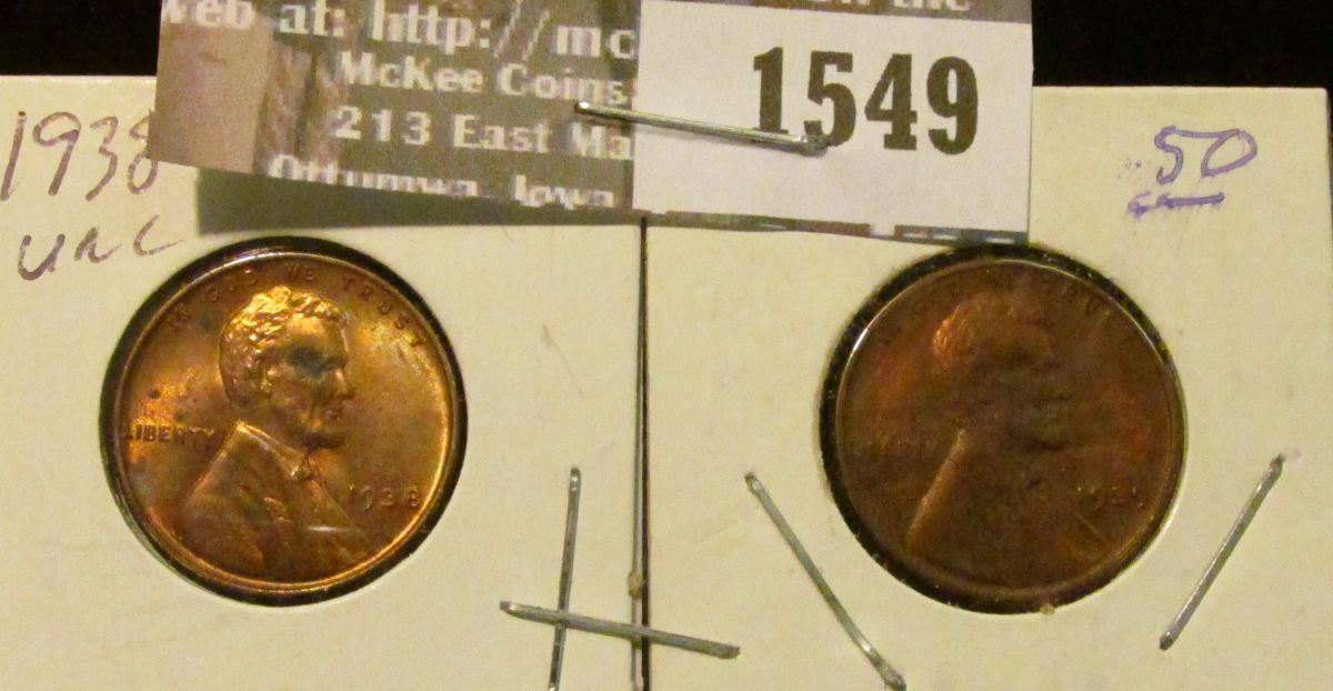 1549 _ 1938 P & 39 P Lincoln Cents, both Uncirculated with some carbon spotting.