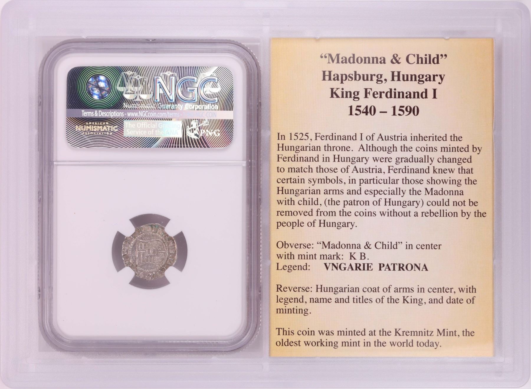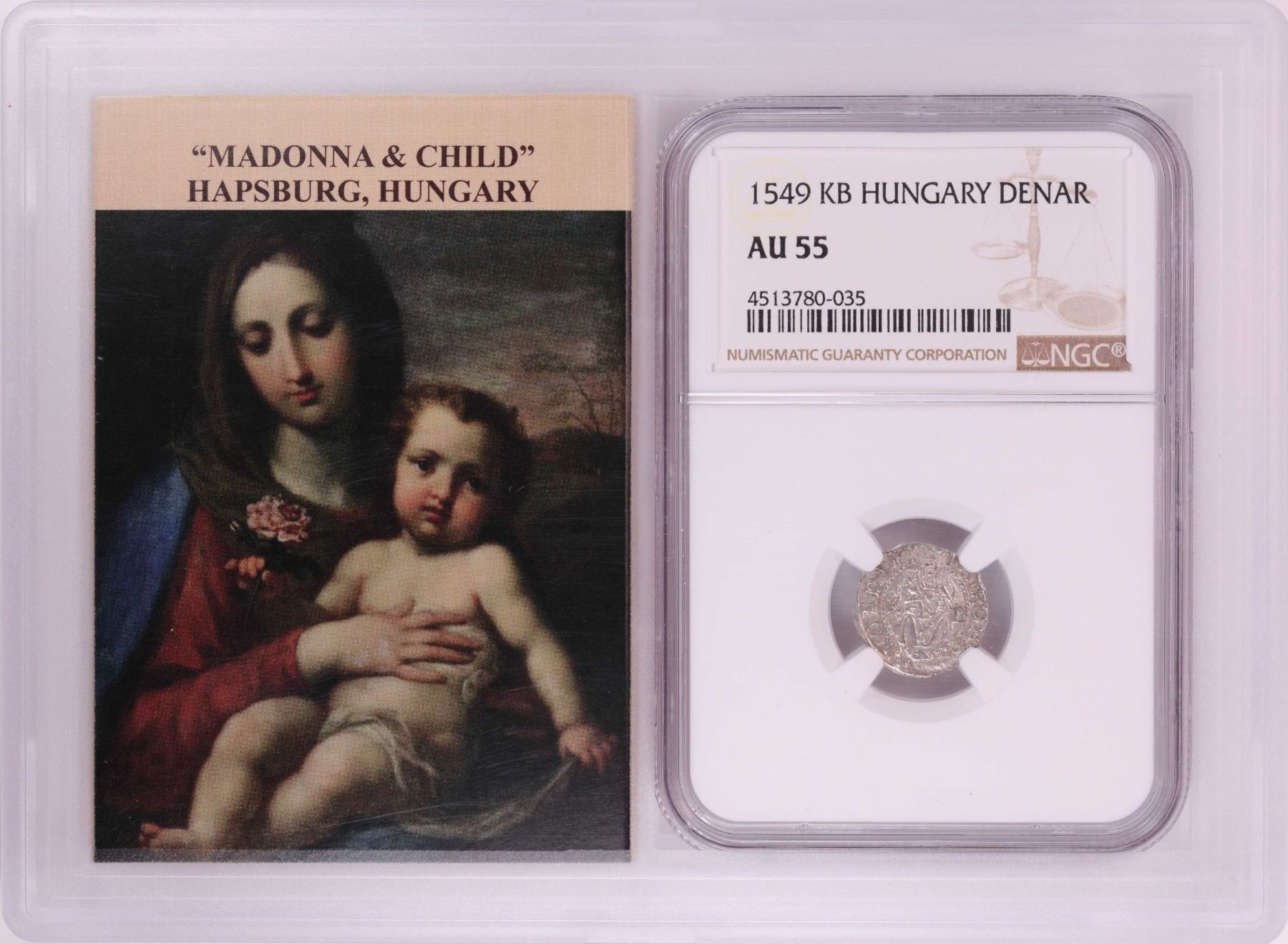 One 1549 KB Hungary Denar 'Madonna and Child' Coin NGC AU55 w/ Story Box.