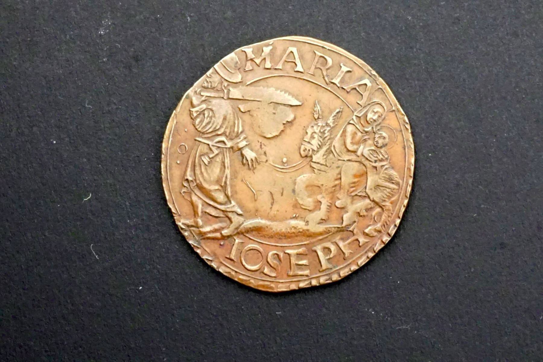 Mary and the infant Jesus on a donkey, led by Joseph MARIA IOSEPH. Reverse: Various tools and instruments, and the date 1549. 29 mm, 5.1 grams. EF+.