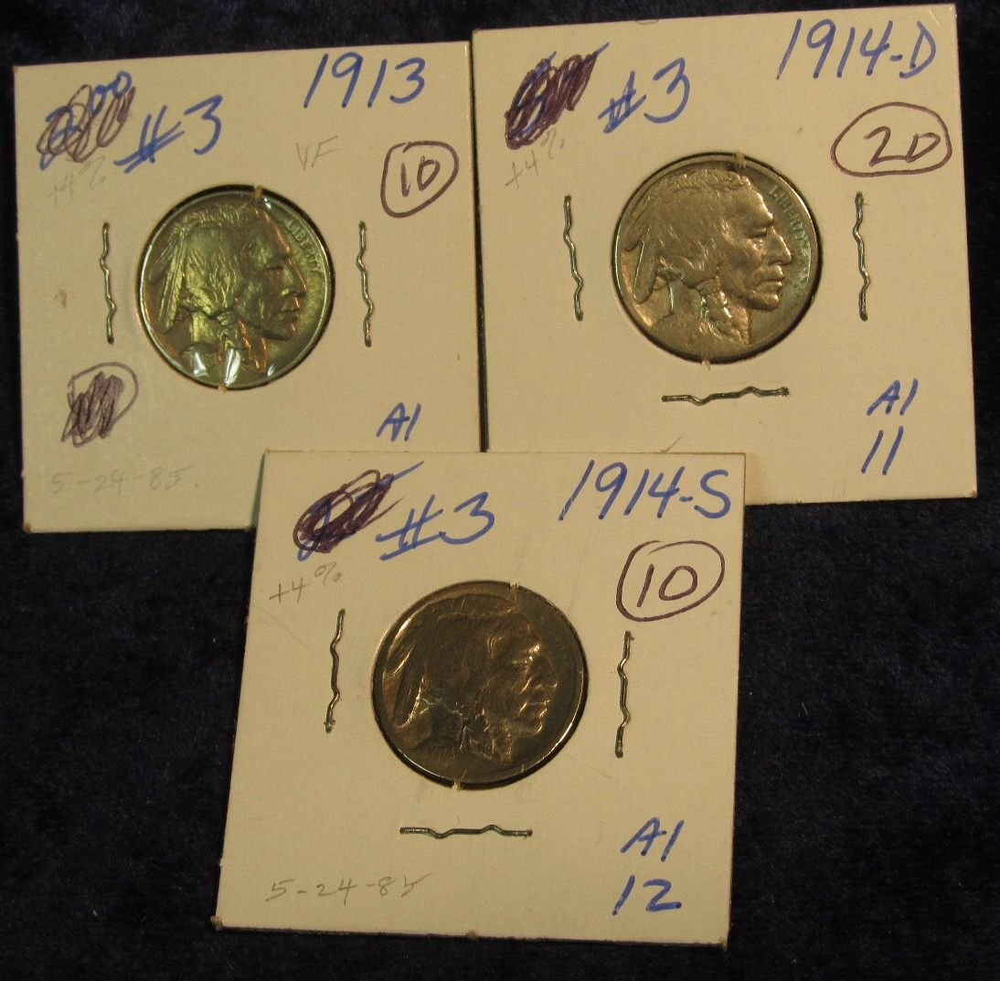 155. 1913 P T.1 VF+, 14 D *key date) G-4, & 14 S G-4 Buffalo Nickels. Redbook value $136.00.
