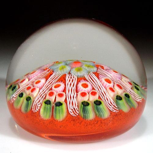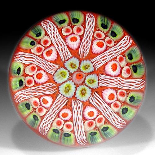 Strathearn patterned millefiori paperweight, with a central white and orange cane, encircled by a ring of canes, and surrounded by nine spokes of white latticinio, dividing panels of canes, on opaque orange ground. Diameter 3". NO RESERVE