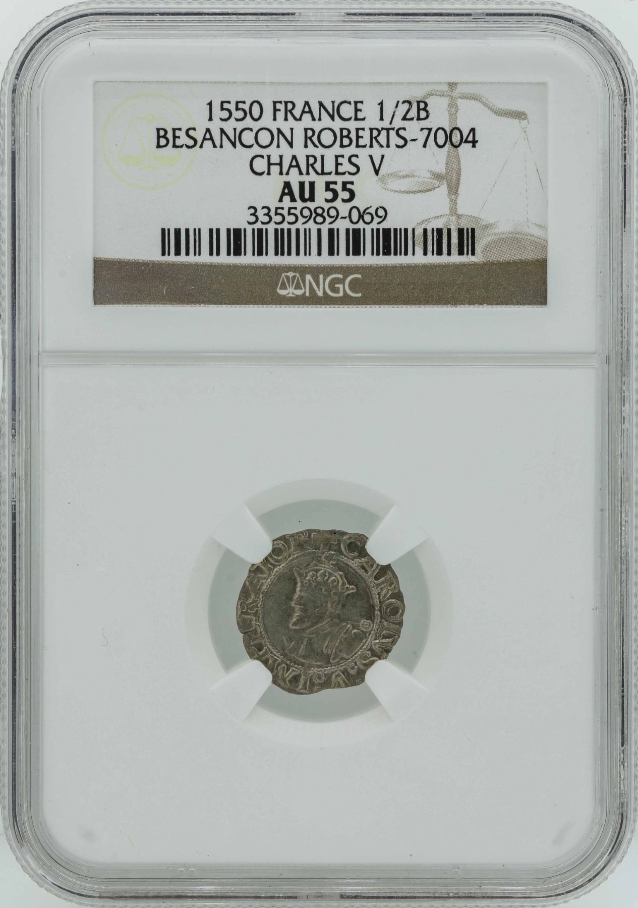 One 1550 France 1/2 Blanc Besancon Robertys Charles V NGC AU55.