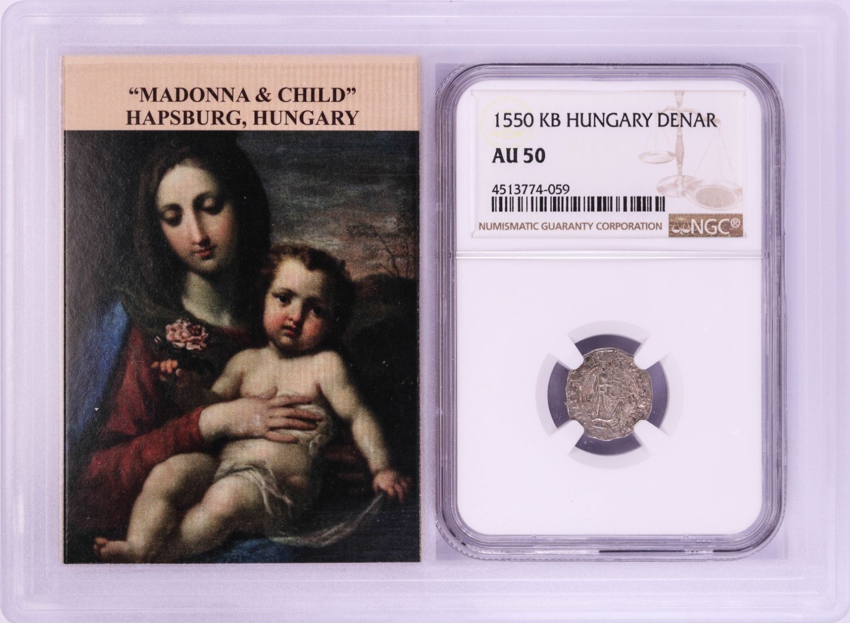 One 1550 KB Hungary Denar 'Madonna and Child' Coin NGC AU50 w/ Story Box.