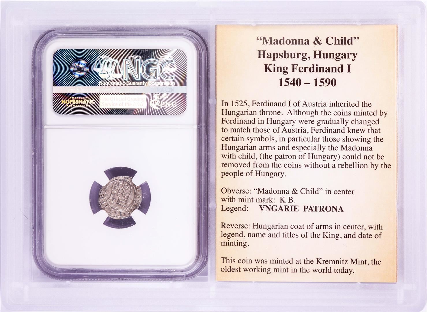 One 1550 KB Hungary Denar 'Madonna and Child' Coin NGC AU50 w/ Story Box. NGC Certified.