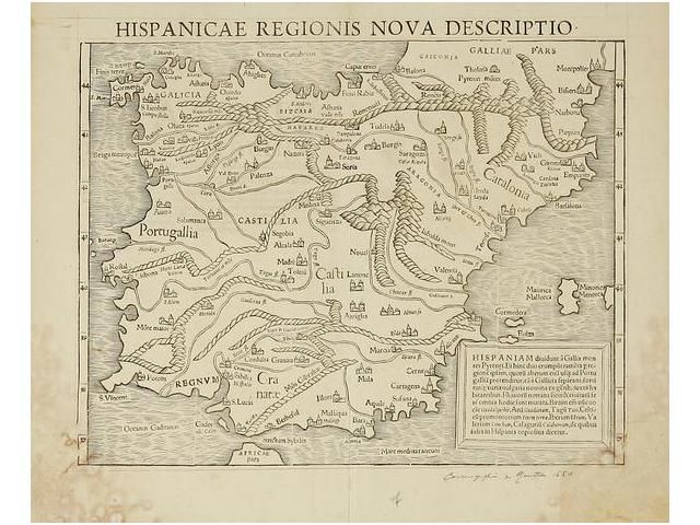 1550 ca. MAPA: (ESPAÑA). [PTOLOMEO:]. HISPANICAE REGIONIS NOVA DESCRIPTIO. Mapa grabado en madera, plancha 25 x 35 cm, papel 32 x 41 cm. Leve señal marginal de humedad. Cartela explicativa y texto al dorso en latín. Perteneciente a la Cosmografia de Munster.