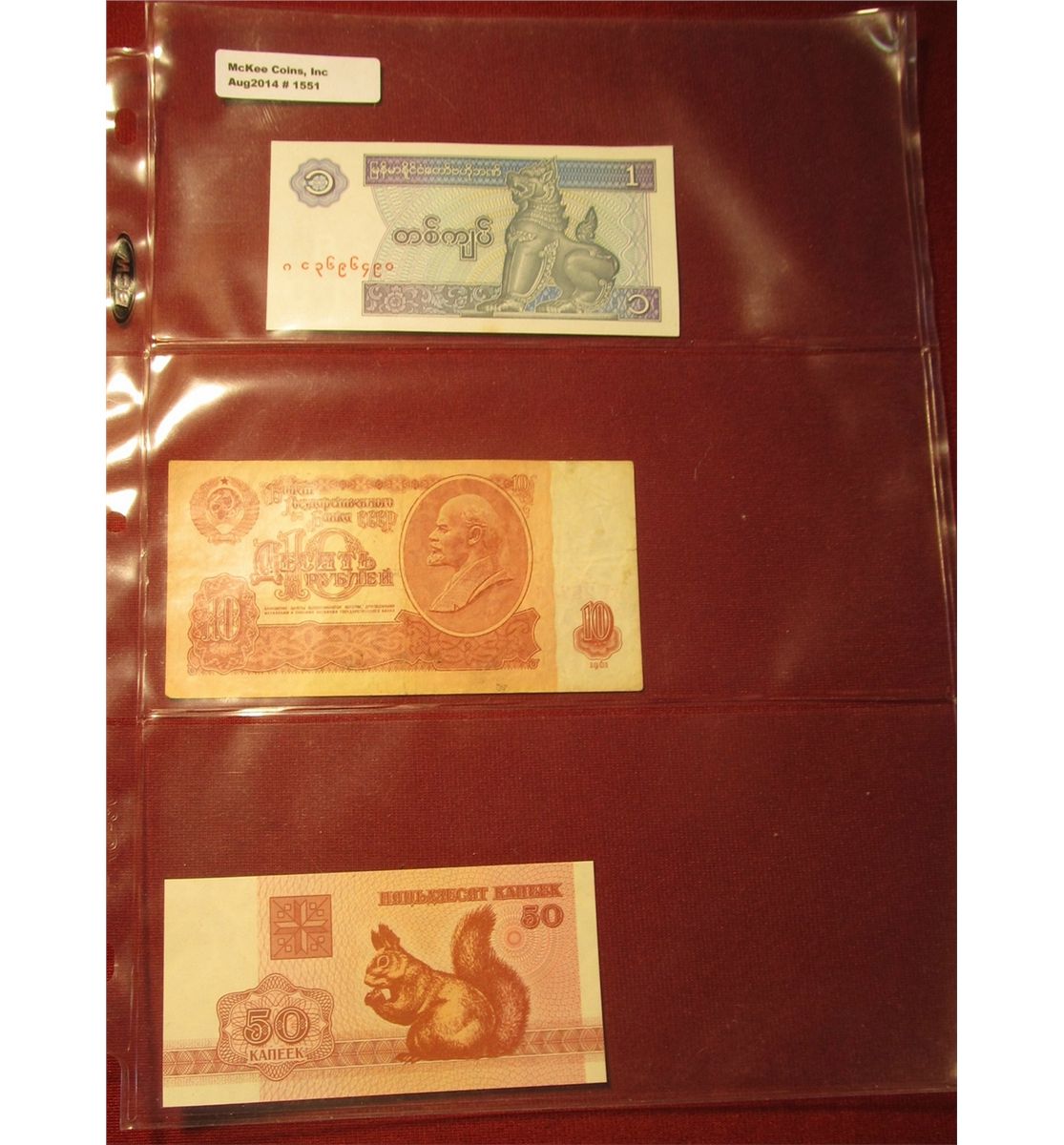 1551. Central Bank of Myanmar One Kyat Bank note CU; 1961 Russia 10 Rouble (depicts Lenin) Bank note; & 1992 Russia 50 Kopek squirrel design. CU. All in a plastic page.