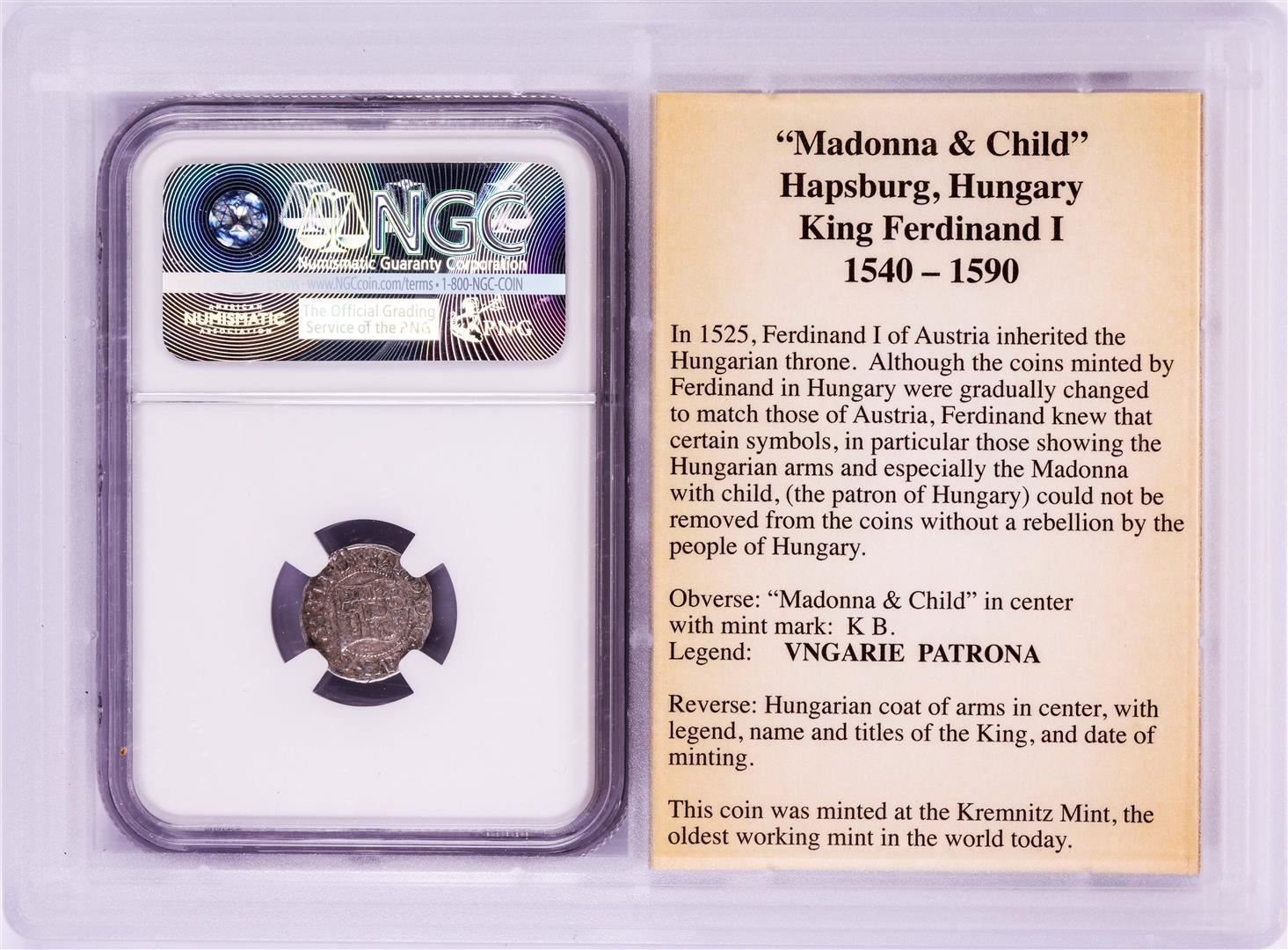 One 1551 KB Hungary Denar 'Madonna and Child' Coin NGC XF40 With Story Box. NGC Certified.
