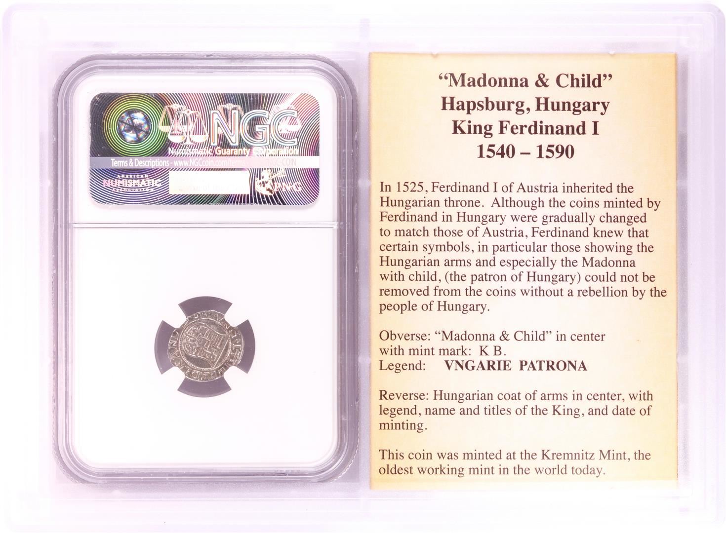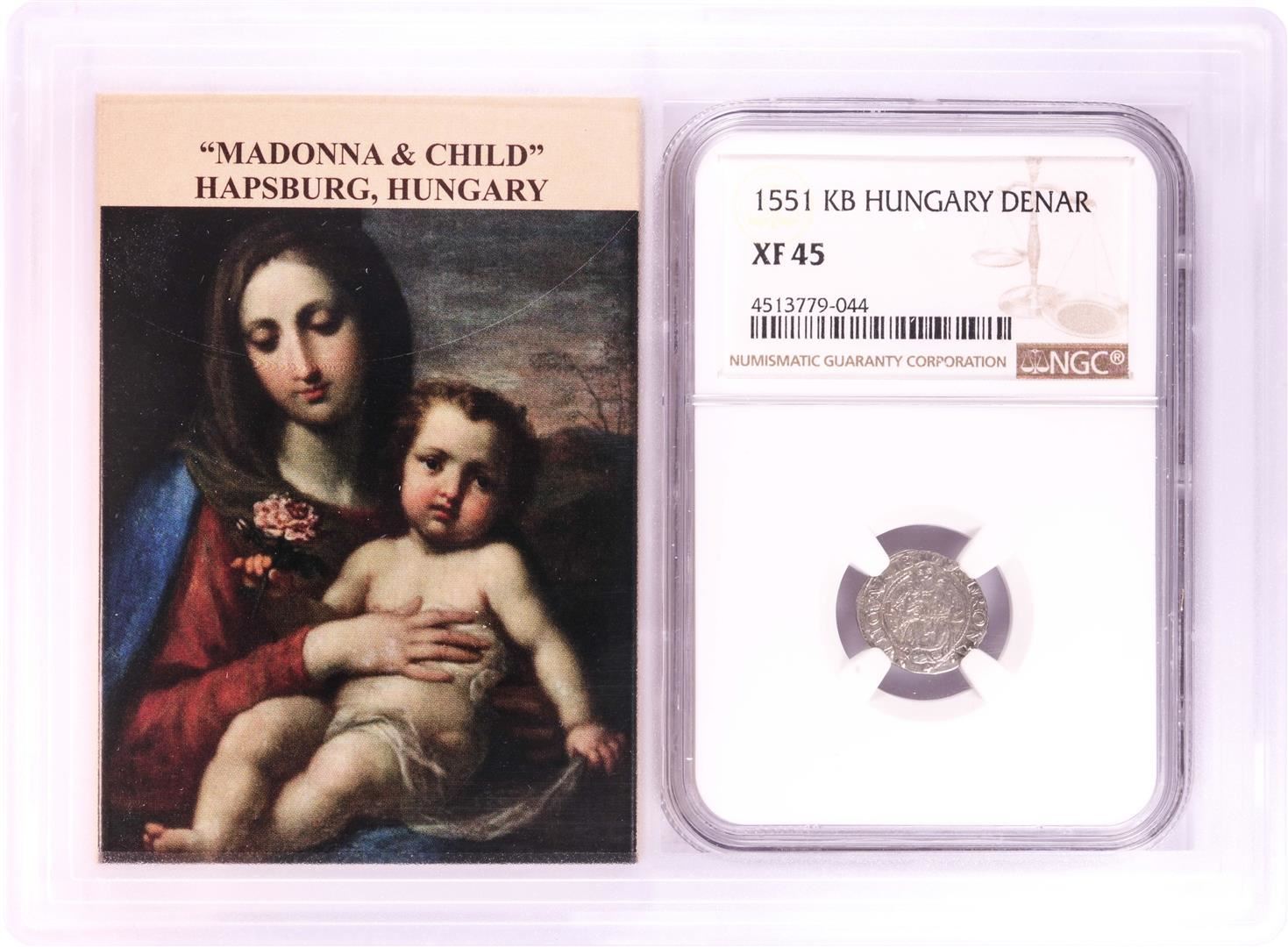 One 1551 KB Hungary Denar 'Madonna and Child' Coin NGC XF45 w/ Story Box. NGC Certified.