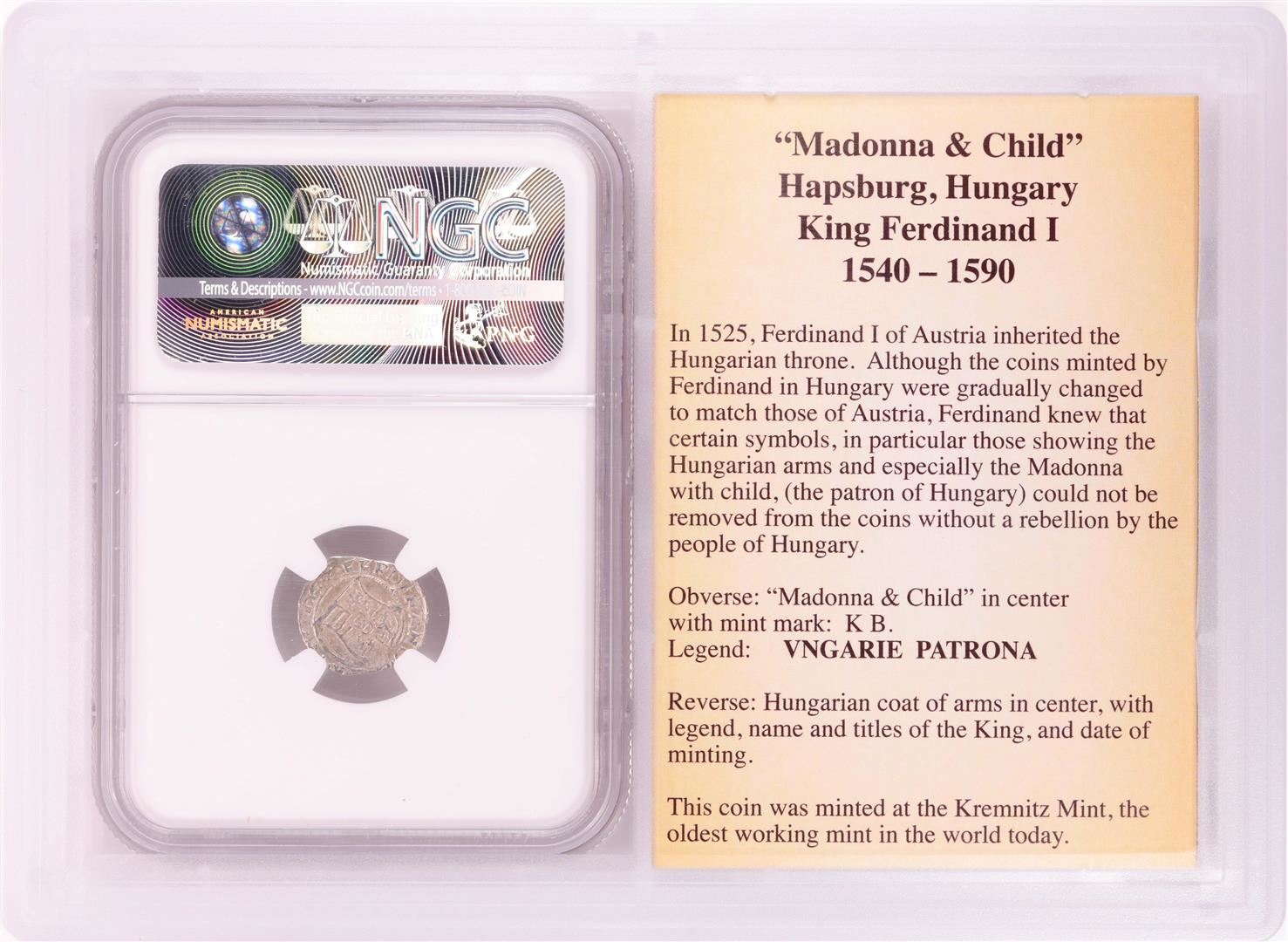 One 1552 KB Hungary Denar 'Madonna and Child' Coin NGC AU50 w/ Story Box. NGC Certified.