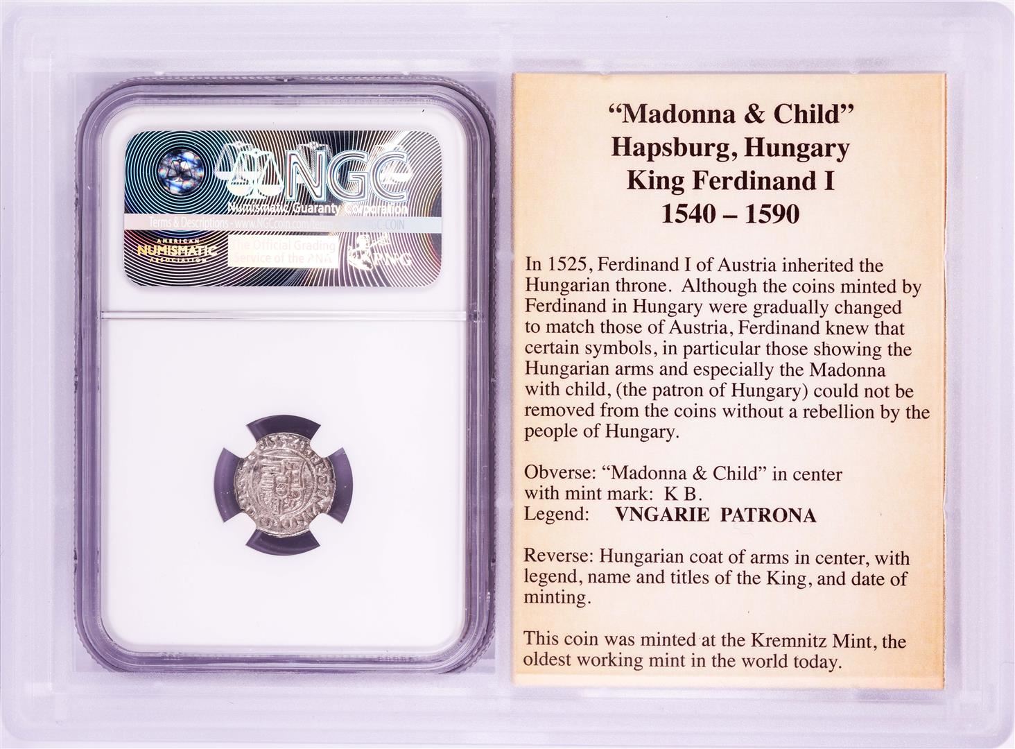 One 1552 KB Hungary Denar 'Madonna and Child' Coin NGC AU55 w/ Story Box. NGC Certified.