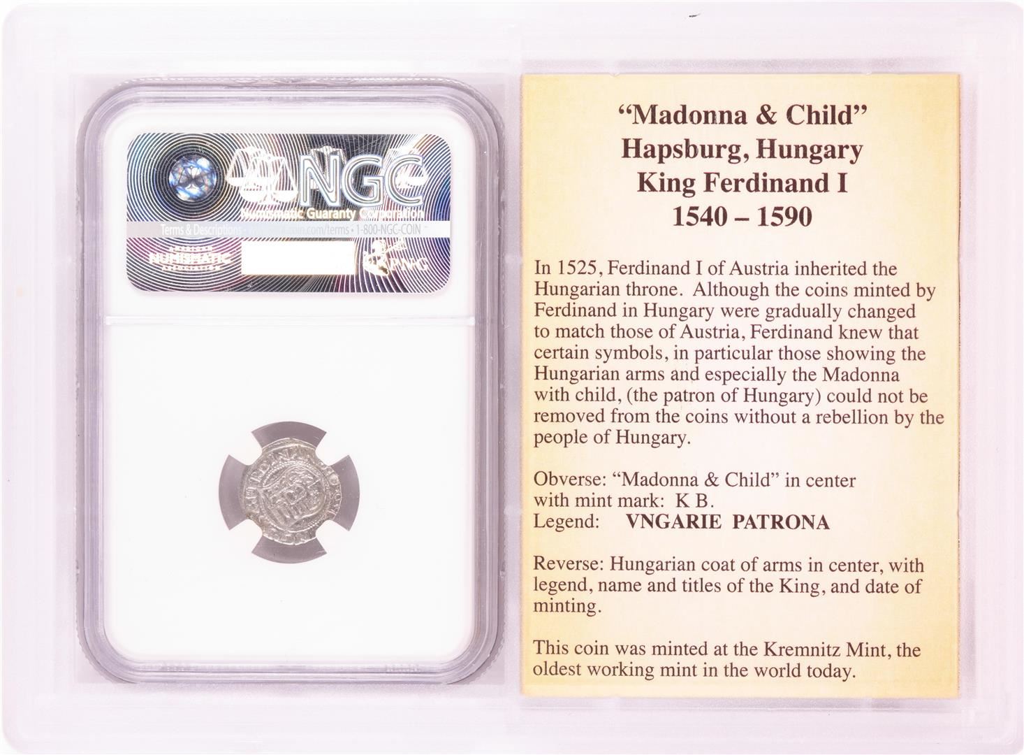 One 1552 KB Hungary Denar 'Madonna and Child' Coin NGC F15 w/ Story Box. NGC Certified.