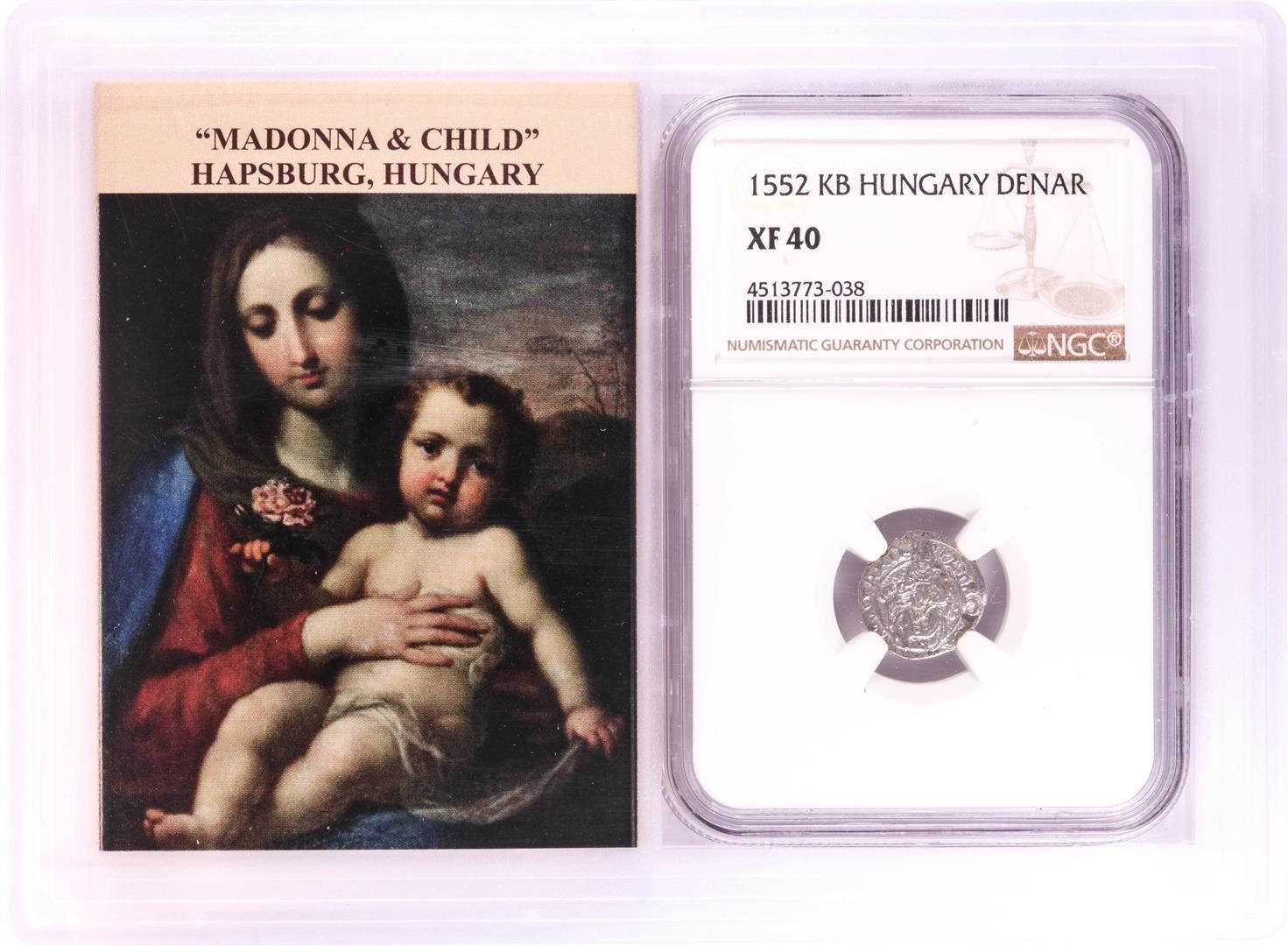 One 1552 KB Hungary Denar 'Madonna and Child' Coin NGC XF40 w/ Story Box. NGC Certified.