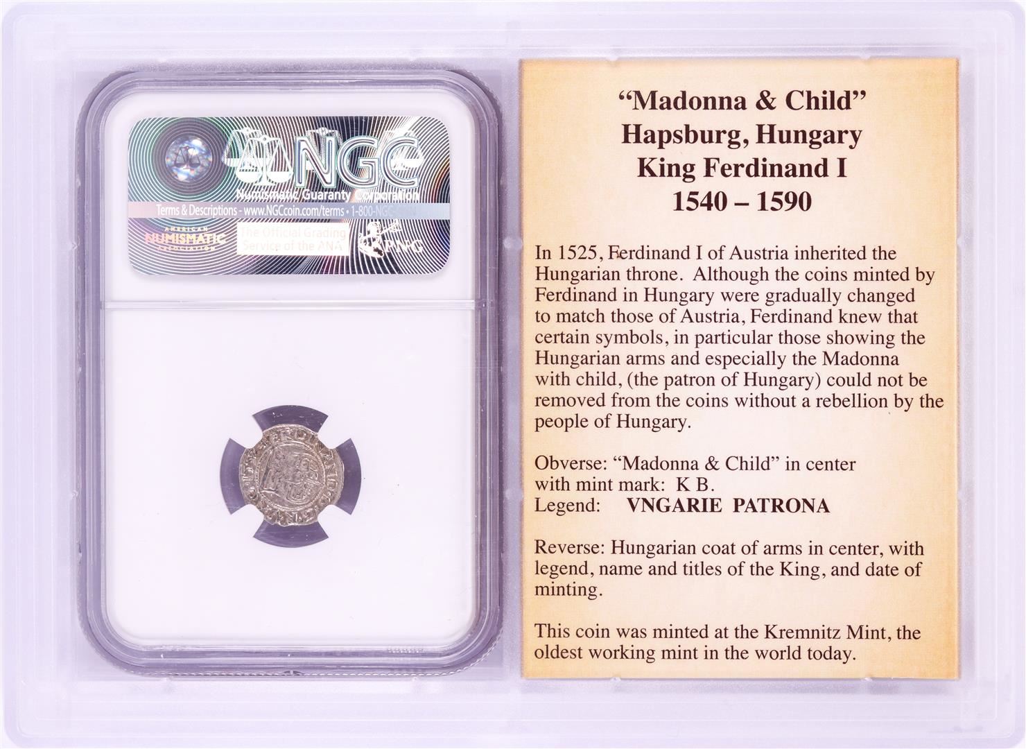 One 1552 KB Hungary Denar 'Madonna and Child' Coin NGC XF40 w/ Story Box. NGC Certified.