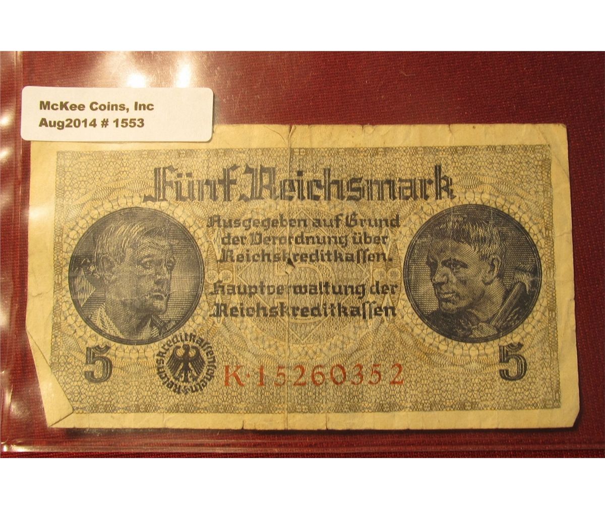 1553. 1939-45 World War II Reich's Credit Treasury Note. Pick # R138. 5 Reichsmark. 8 digit serial number. Scarce.