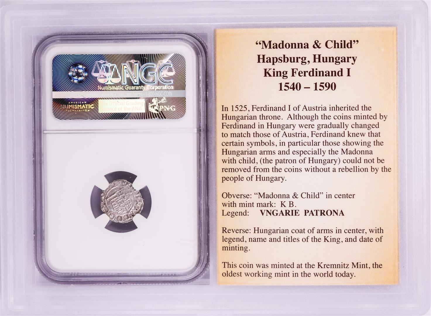 One 1553 KB Hungary Denar 'Madonna and Child' Coin NGC XF45 w/ Story Box. NGC Certified.