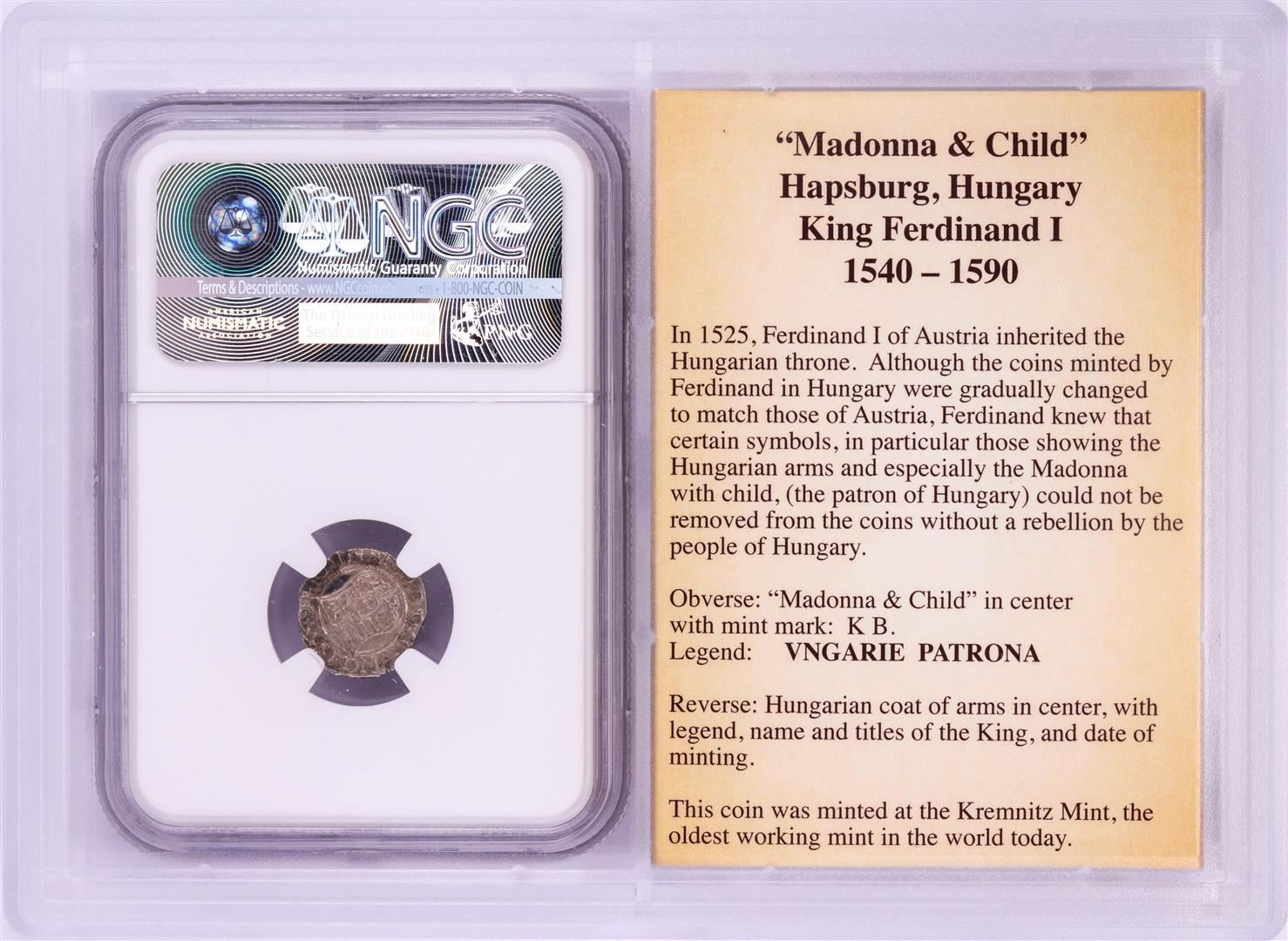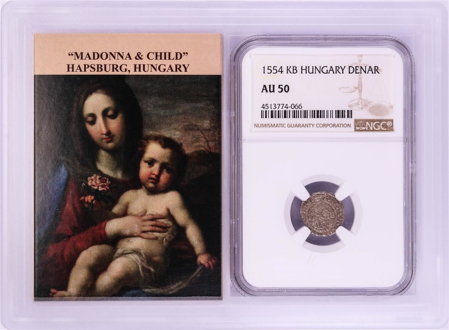 One 1554 KB Hungary Denar 'Madonna and Child' Coin NGC AU50 w/ Story Box. NGC Certified.