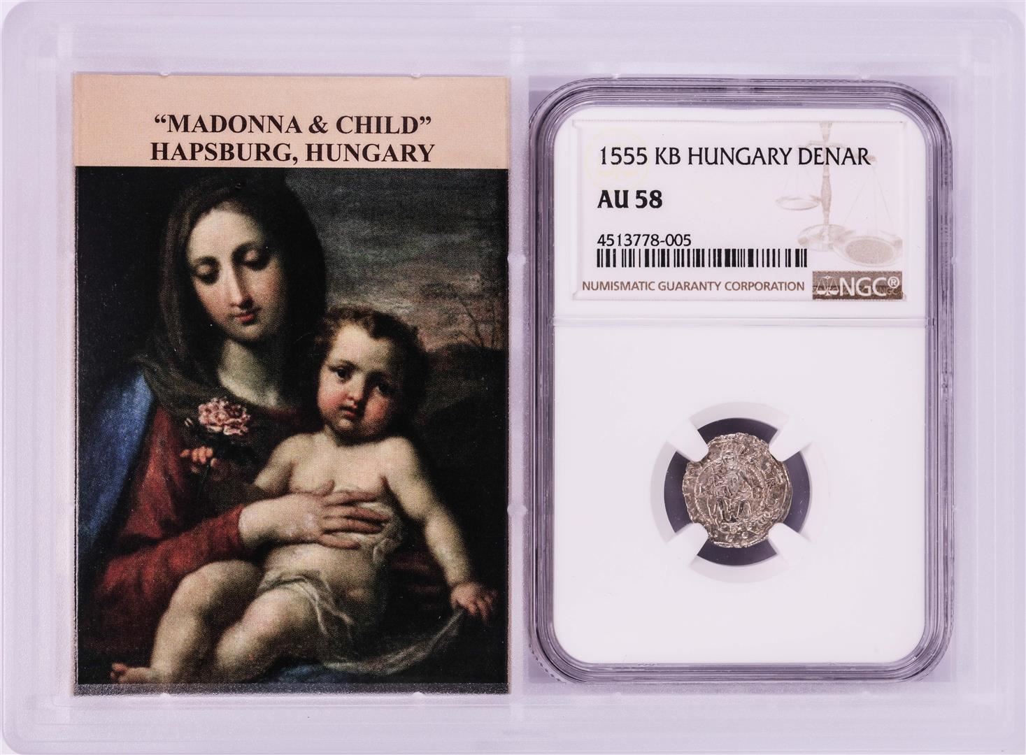 One 1555 KB Hungary Denar 'Madonna and Child' Coin NGC AU58 w/ Story Box. NGC Certified.