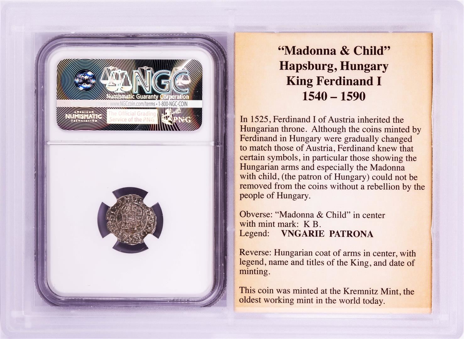 One 1556 KB Hungary Denar 'Madonna and Child' Coin NGC MS61 w/ Story Box. NGC Certified.