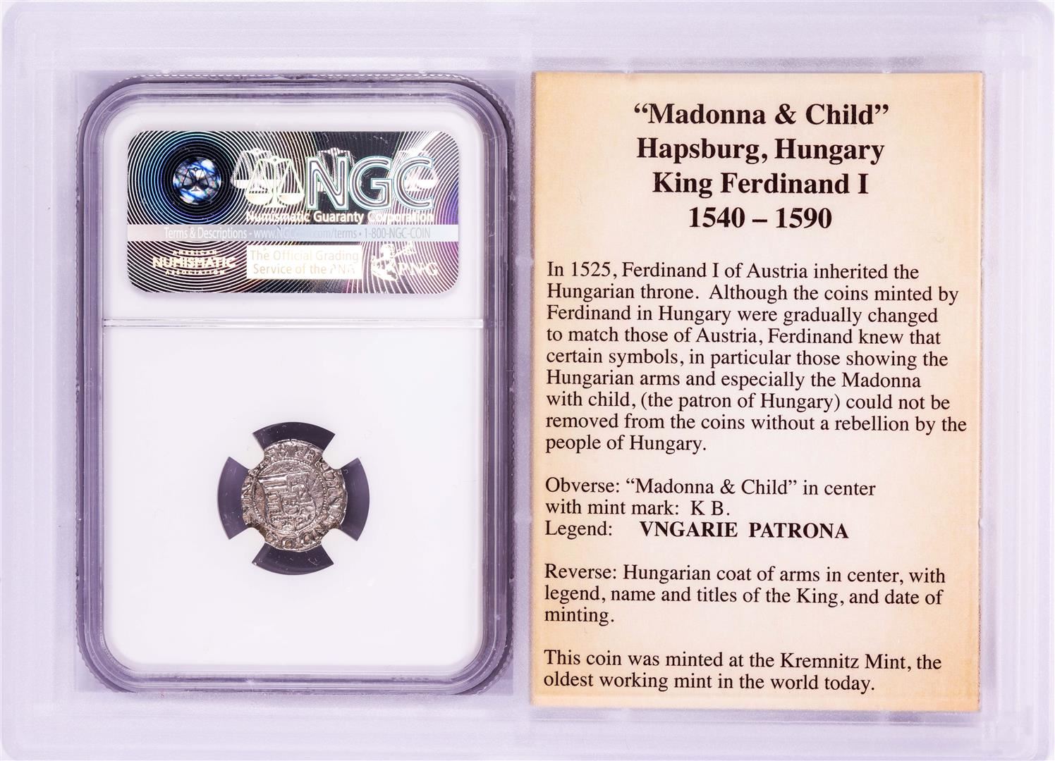 One 1558 KB Hungary Denar 'Madonna and Child' Coin NGC XF45 w/ Story Box. NGC Certified.