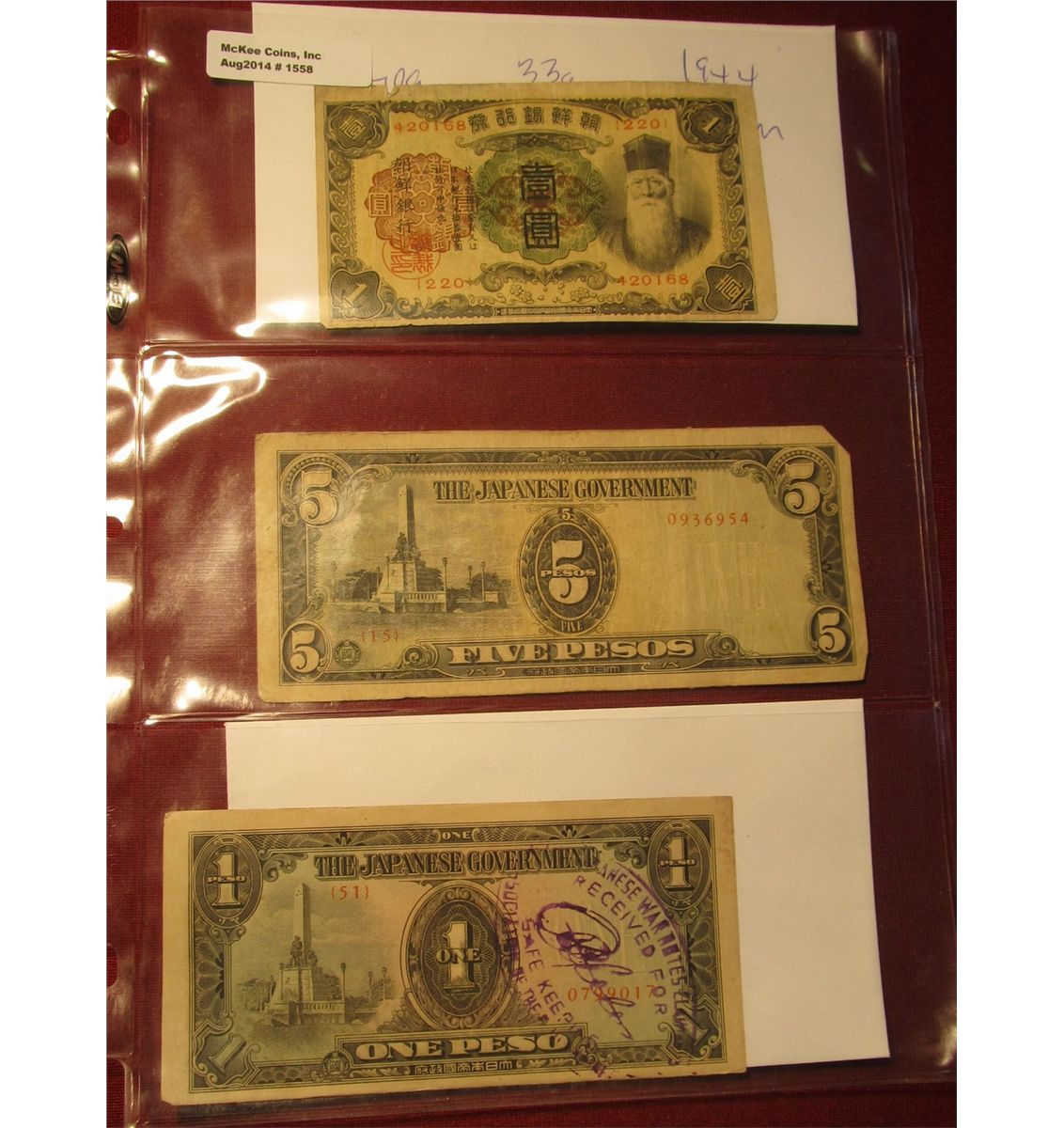 1558. Korea 1944 & (2) Japanese Occupation of World War II Philippines bank notes.