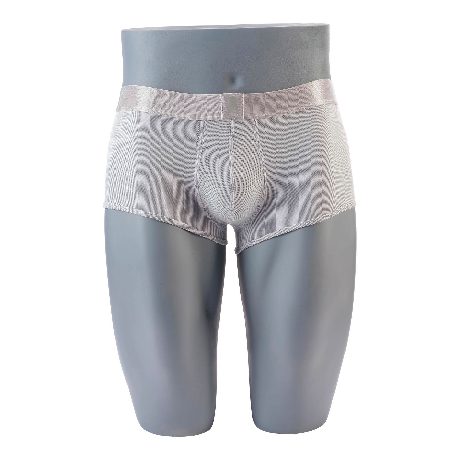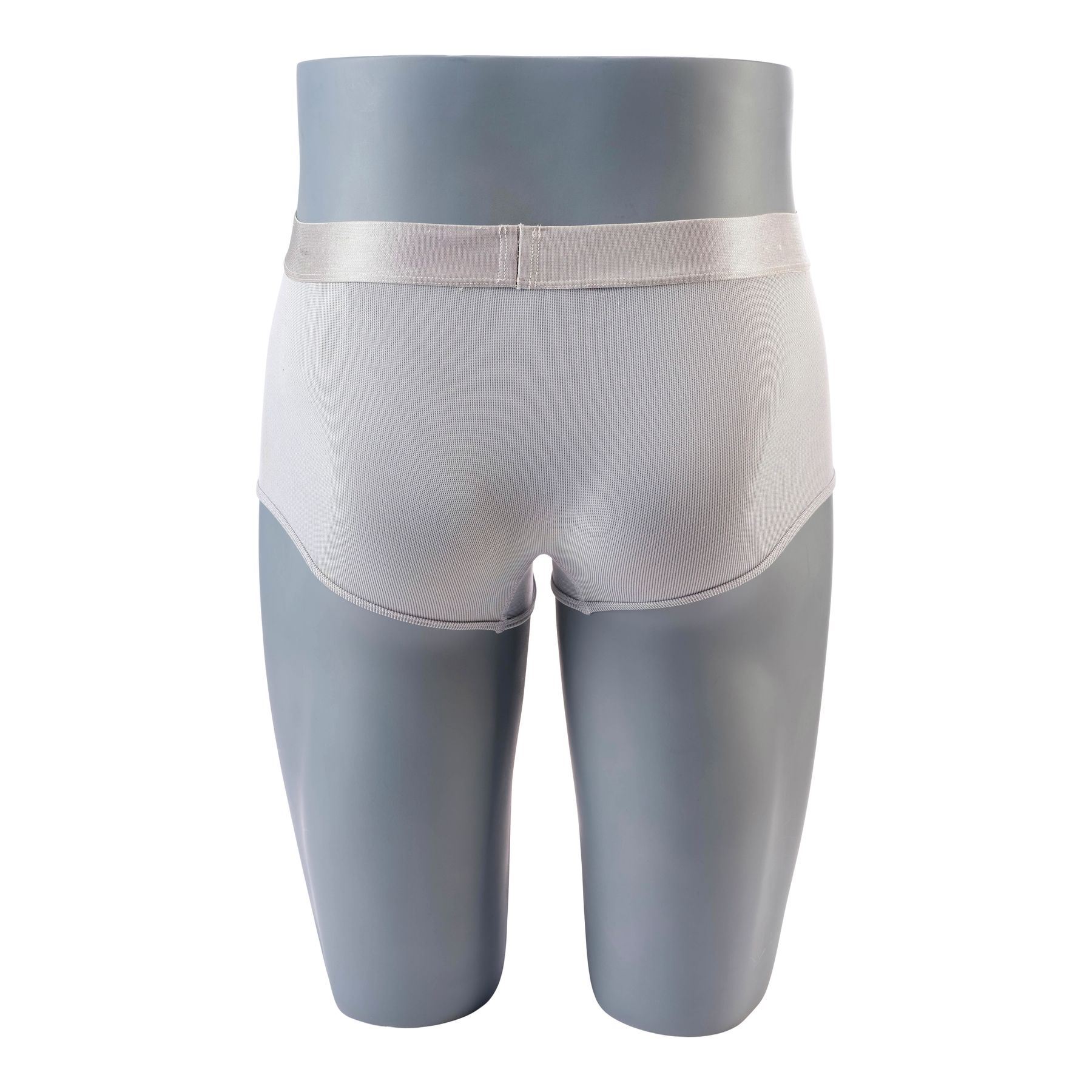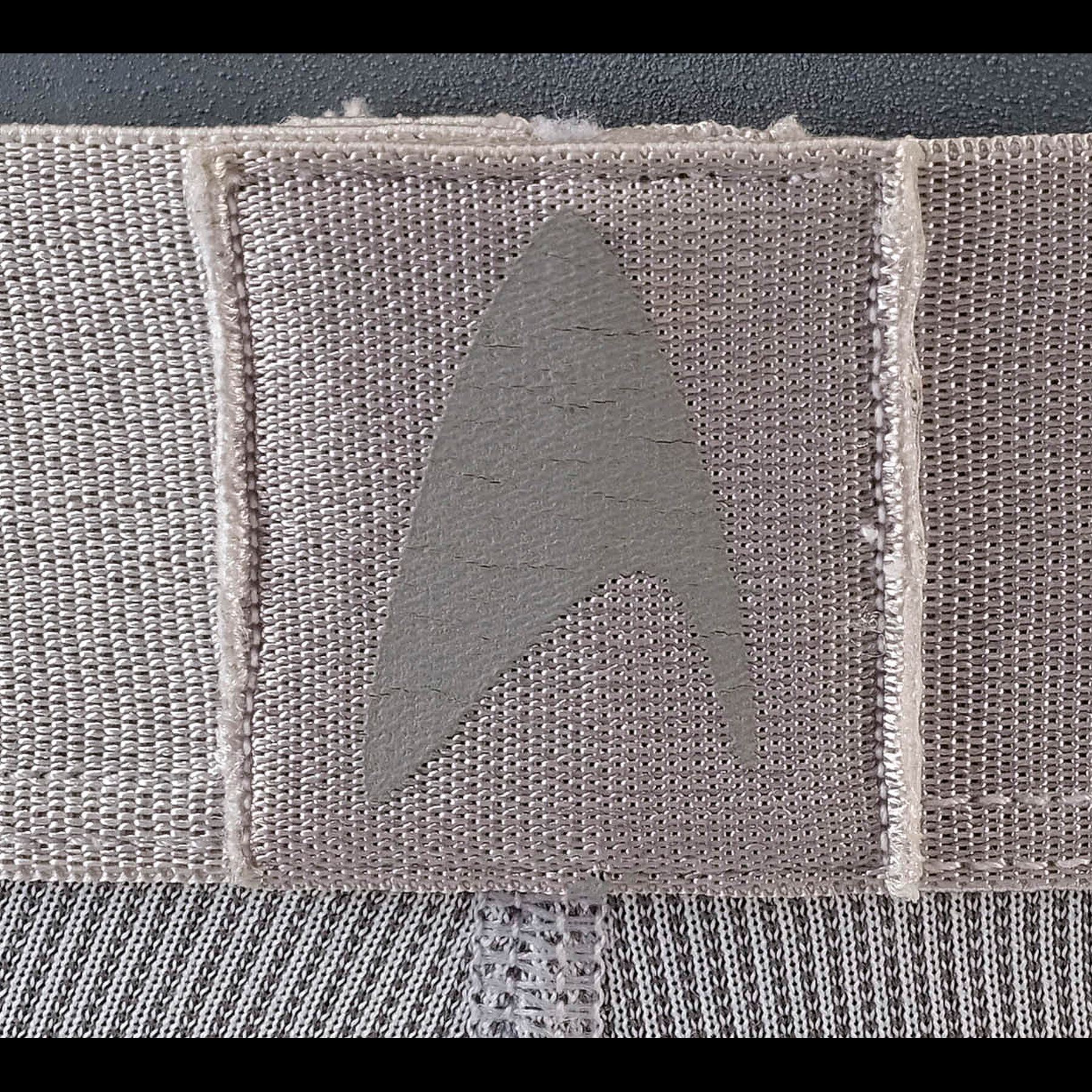 This pair of underwear is made from a silver-color elastane-blend fabric with a matching waistband featuring the Starfleet delta on the front. The waistband exhibits some minor fraying to the material.