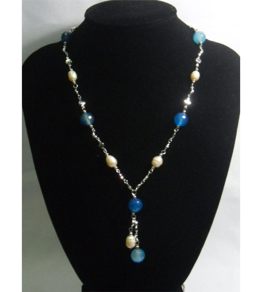 155CTW BLUE CARNELIAN EMERALD CUT AND WHITE PEARL SILVE **|**|** 155CTW BLUE CARNELIAN EMERALD CUT AND WHITE PEARL SILVER NECKLACE; AUTHENTIC PHILIPPINE PEARL; METAL-SILVER ; MSRP: $150