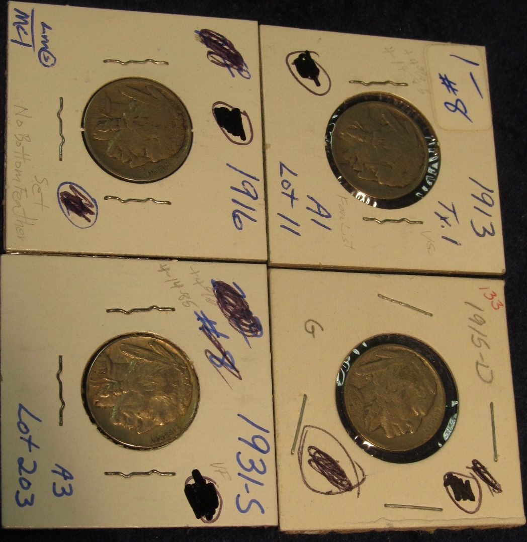 156. 1913 P T.1 F-12, 15 D G-4, 16 P VF, & 31 S EF Buffalo Nickels. Redbook value $81.00.