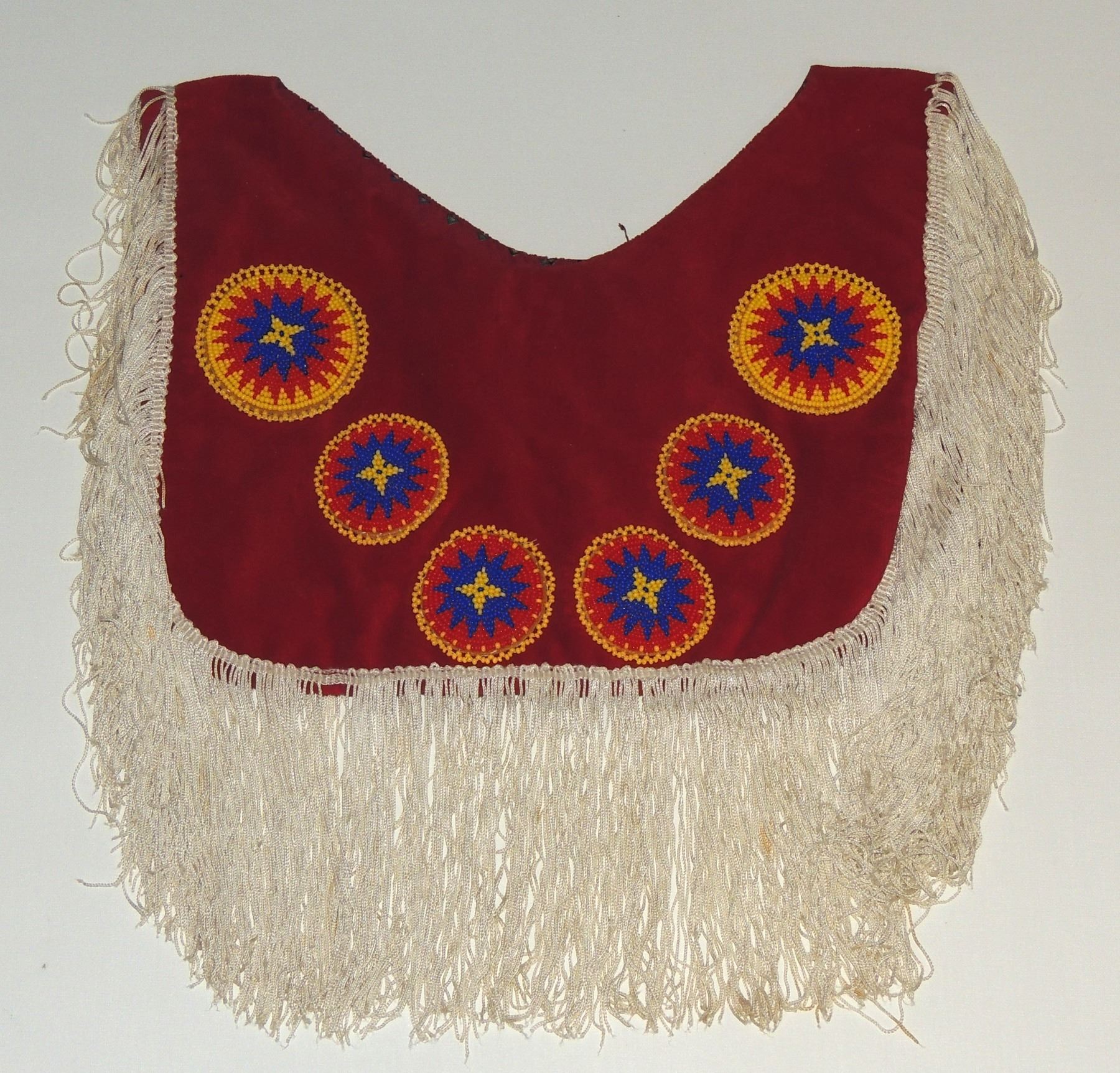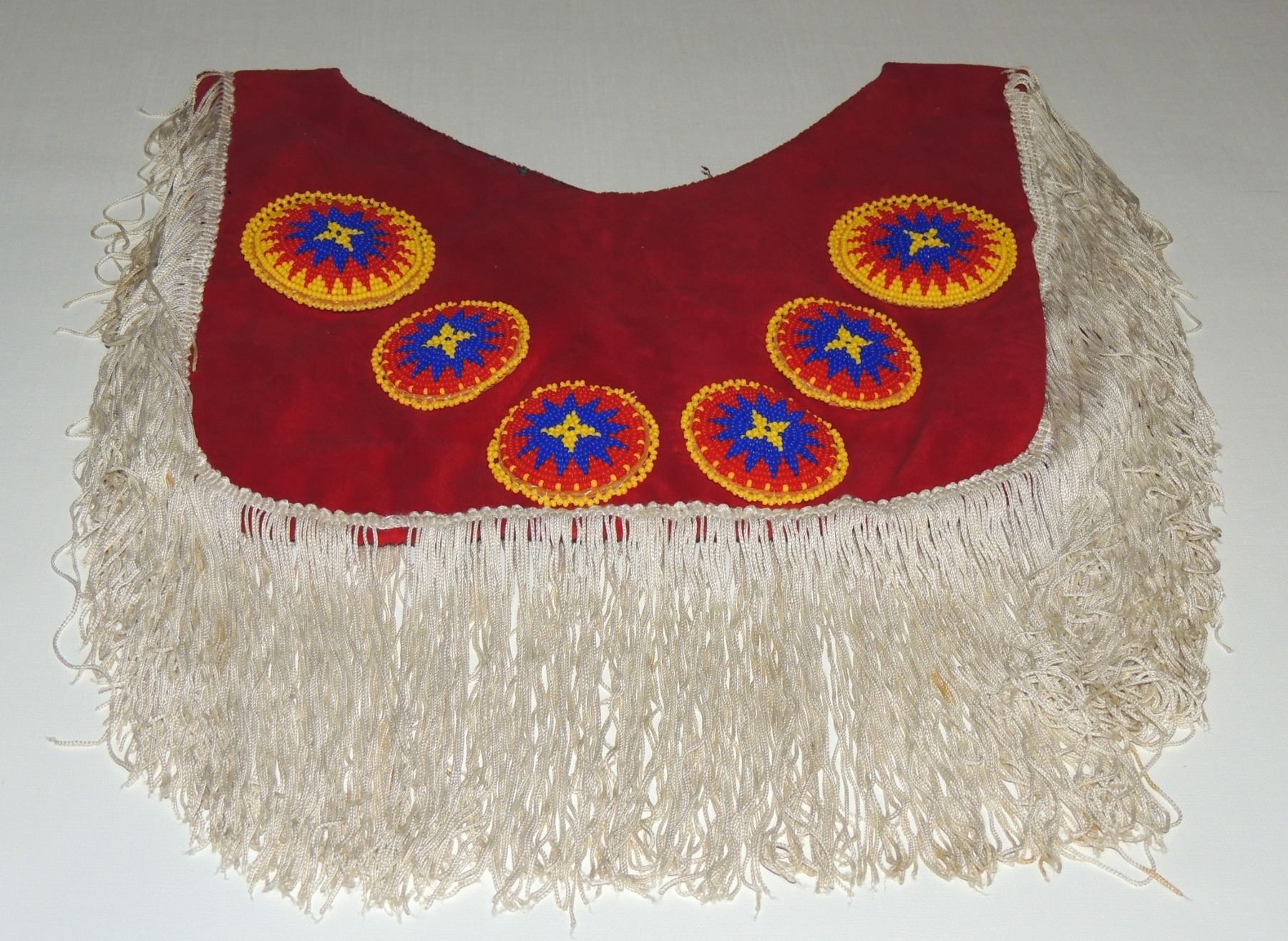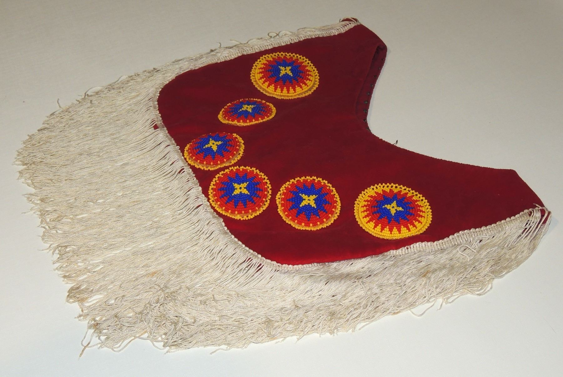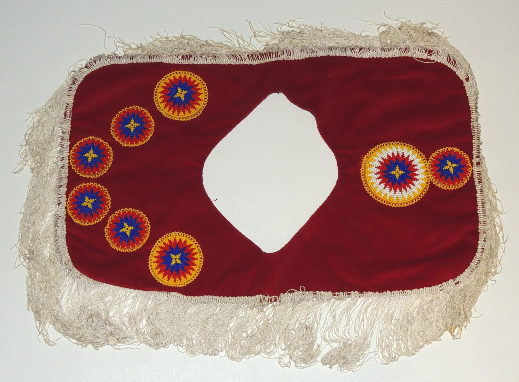 Appears Early 20th Century, with Ornate Circular Beadwork on Front and Reverse. Shawl Measures 13 Inches Wide, 10.5 Inches long at tallest, and 7 inches at shortest- Neck Hole is 8.5 Inches by 7 Inches. Western Cloth used for Interior with square patterns. Please see our Other Auctions for additional - First Nations -Aboriginal -Indigenous Peoples- Metis - Iniut - Native American - Plains Indian - Artefacts