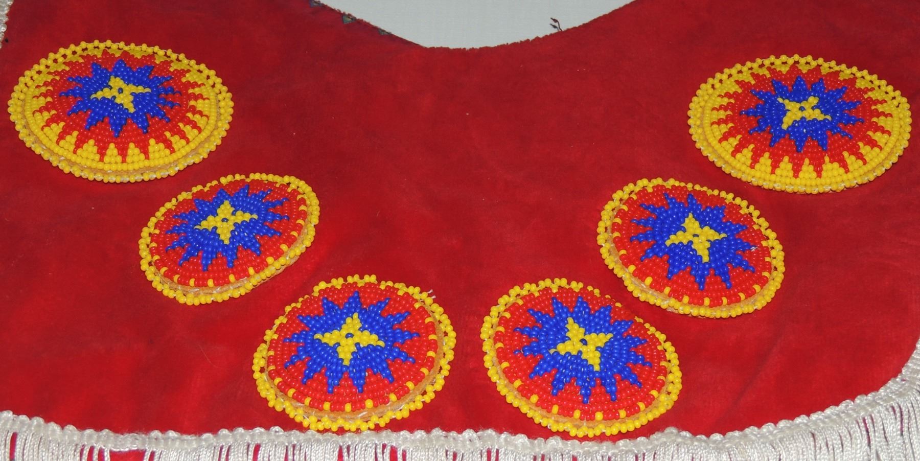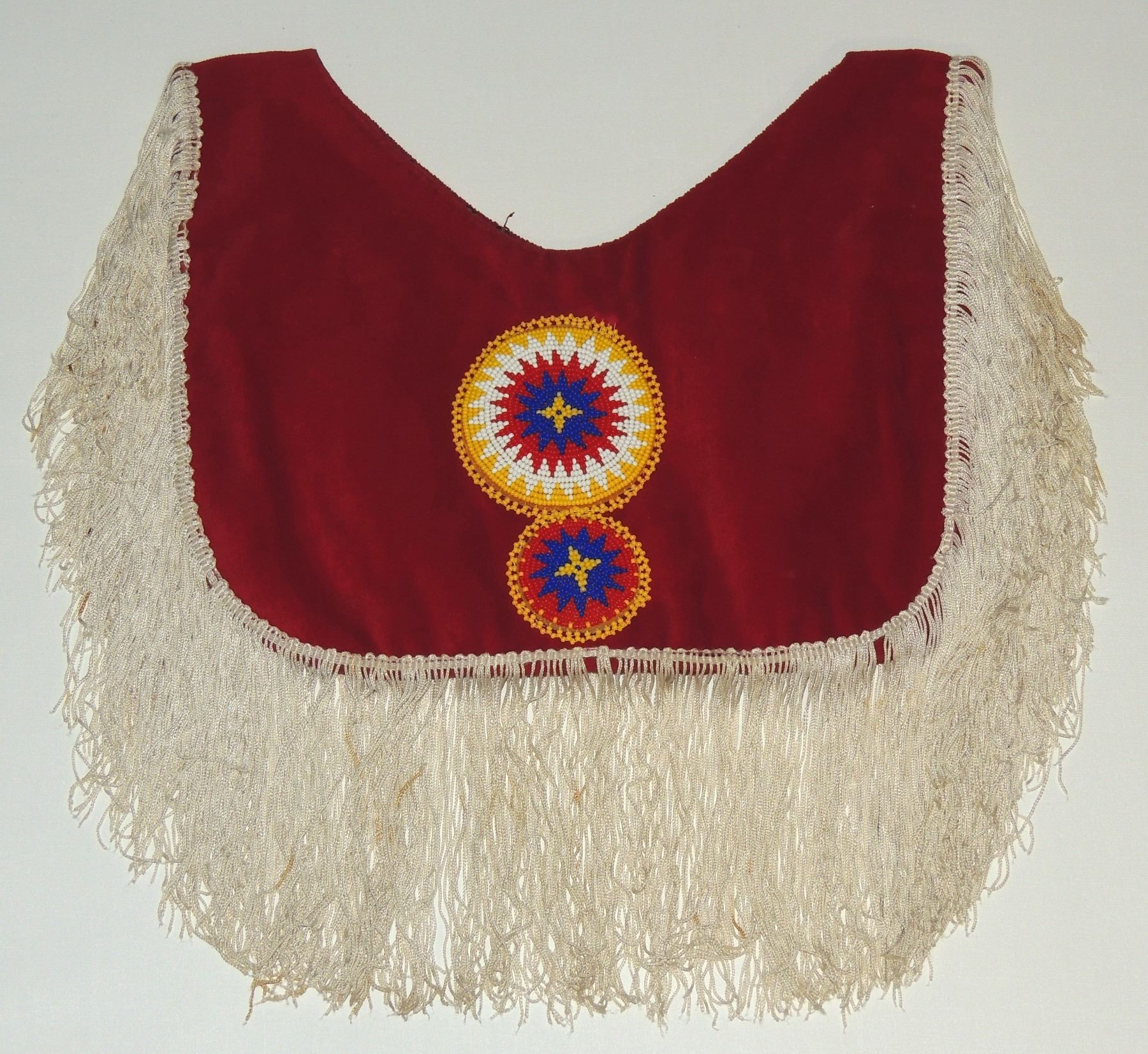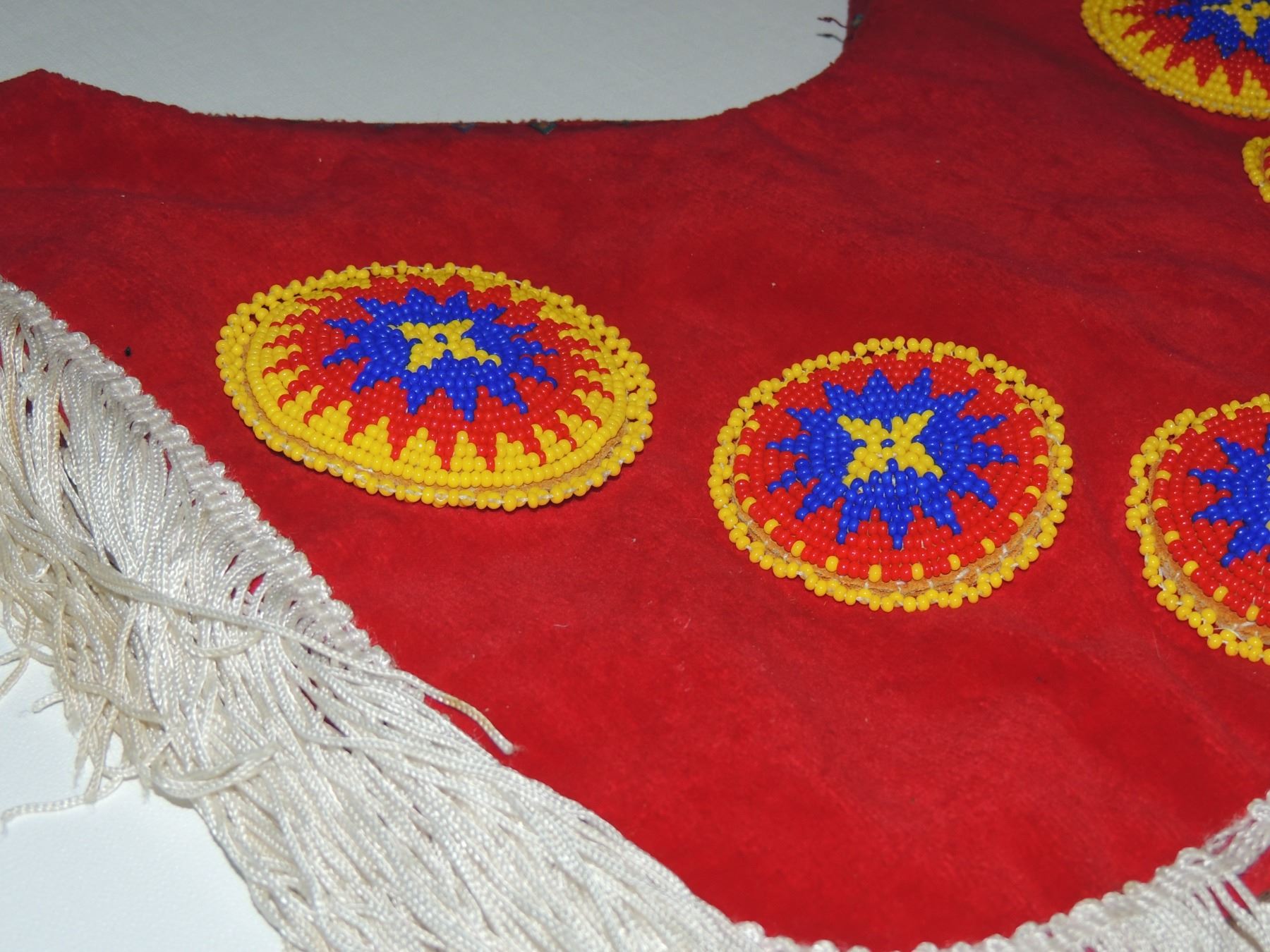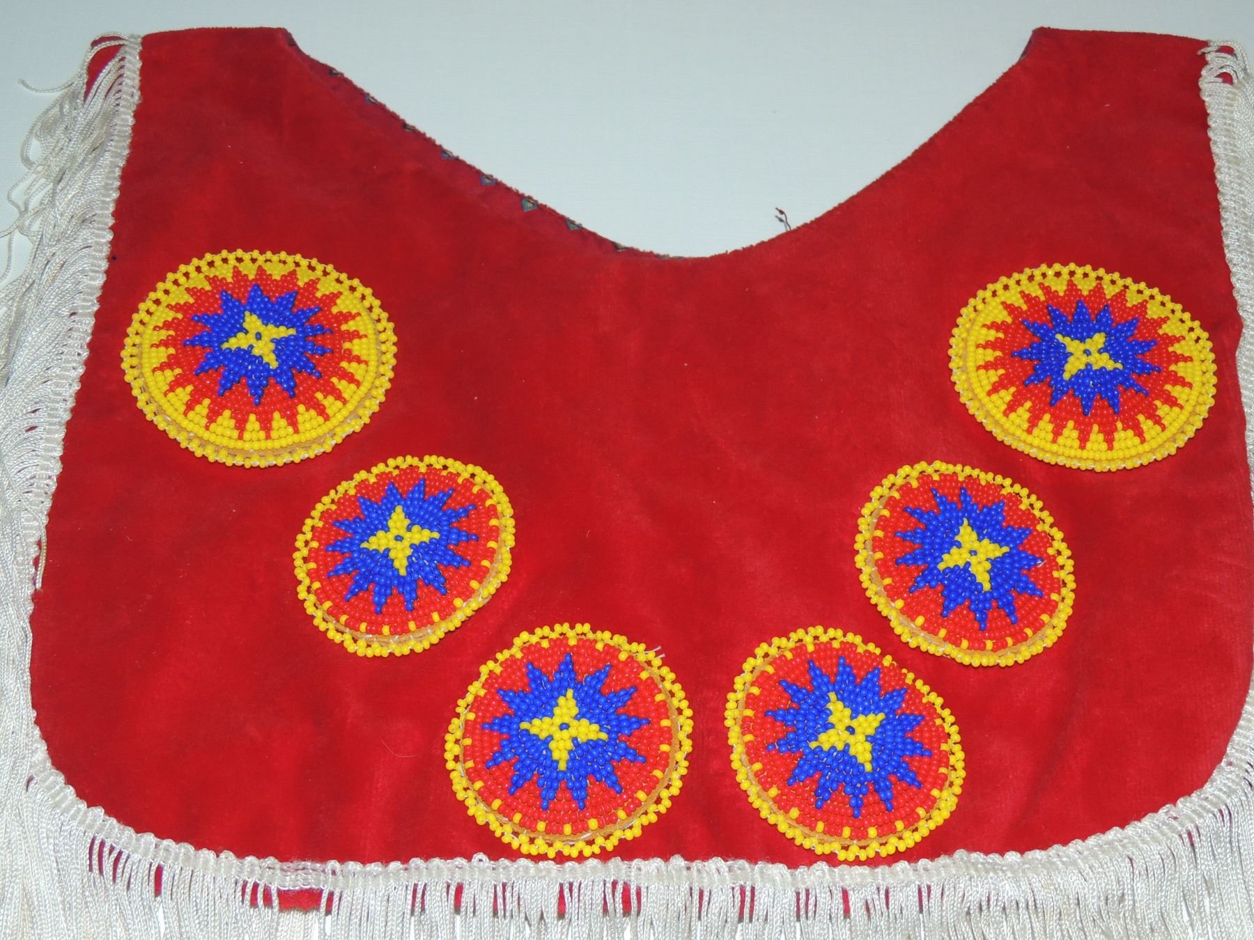 Appears Early 20th Century, with Ornate Circular Beadwork on Front and Reverse. Shawl Measures 13 Inches Wide, 10.5 Inches long at tallest, and 7 inches at shortest- Neck Hole is 8.5 Inches by 7 Inches. Western Cloth used for Interior with square patterns. Please see our Other Auctions for additional - First Nations -Aboriginal -Indigenous Peoples- Metis - Iniut - Native American - Plains Indian - Artefacts