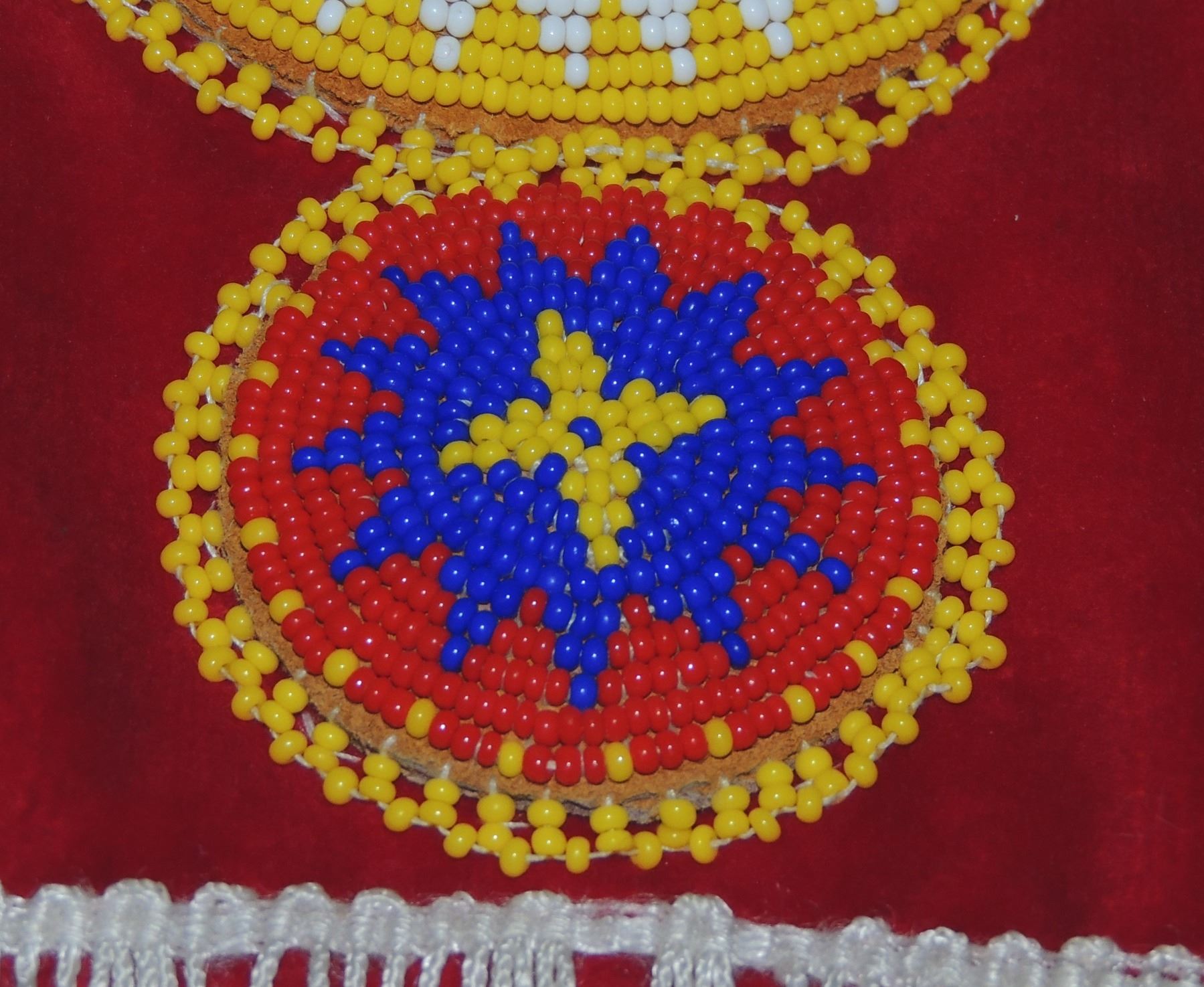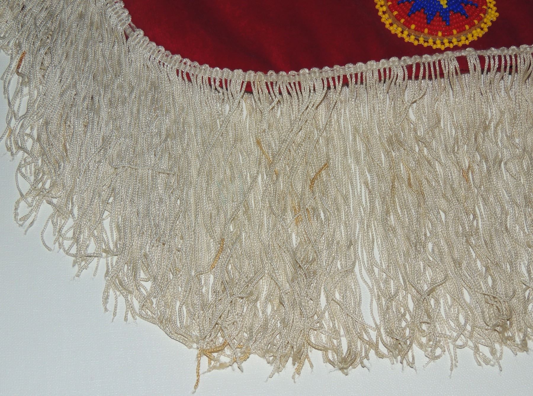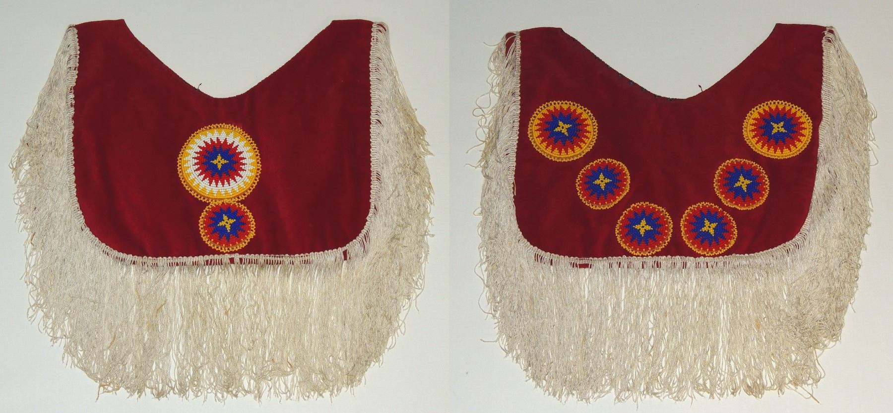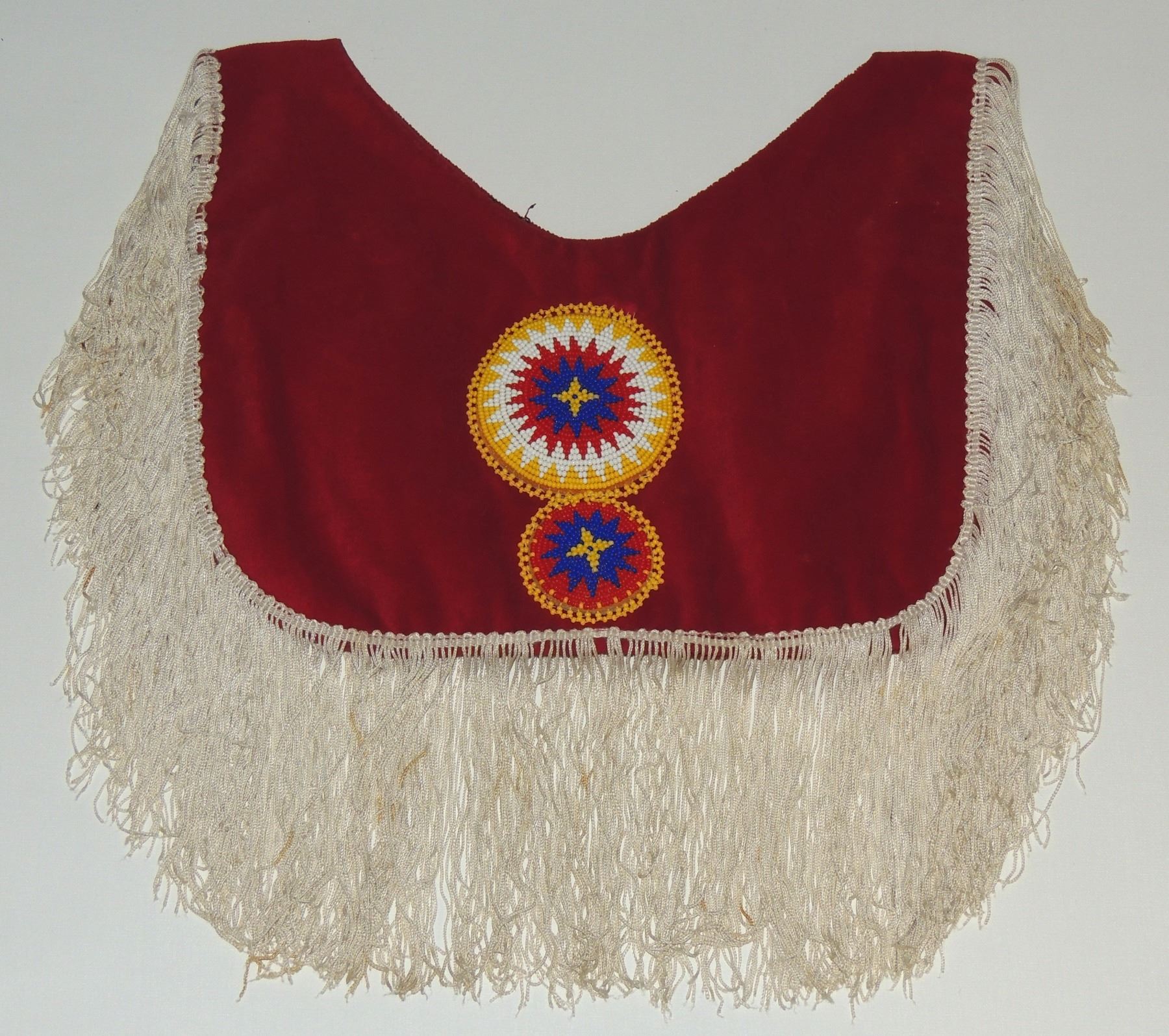 Appears Early 20th Century, with Ornate Circular Beadwork on Front and Reverse. Shawl Measures 13 Inches Wide, 10.5 Inches long at tallest, and 7 inches at shortest- Neck Hole is 8.5 Inches by 7 Inches. Western Cloth used for Interior with square patterns. Please see our Other Auctions for additional - First Nations -Aboriginal -Indigenous Peoples- Metis - Iniut - Native American - Plains Indian - Artefacts