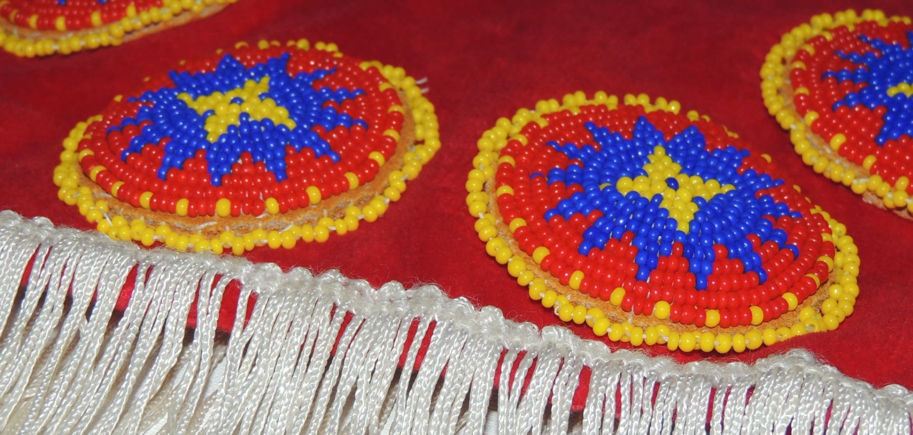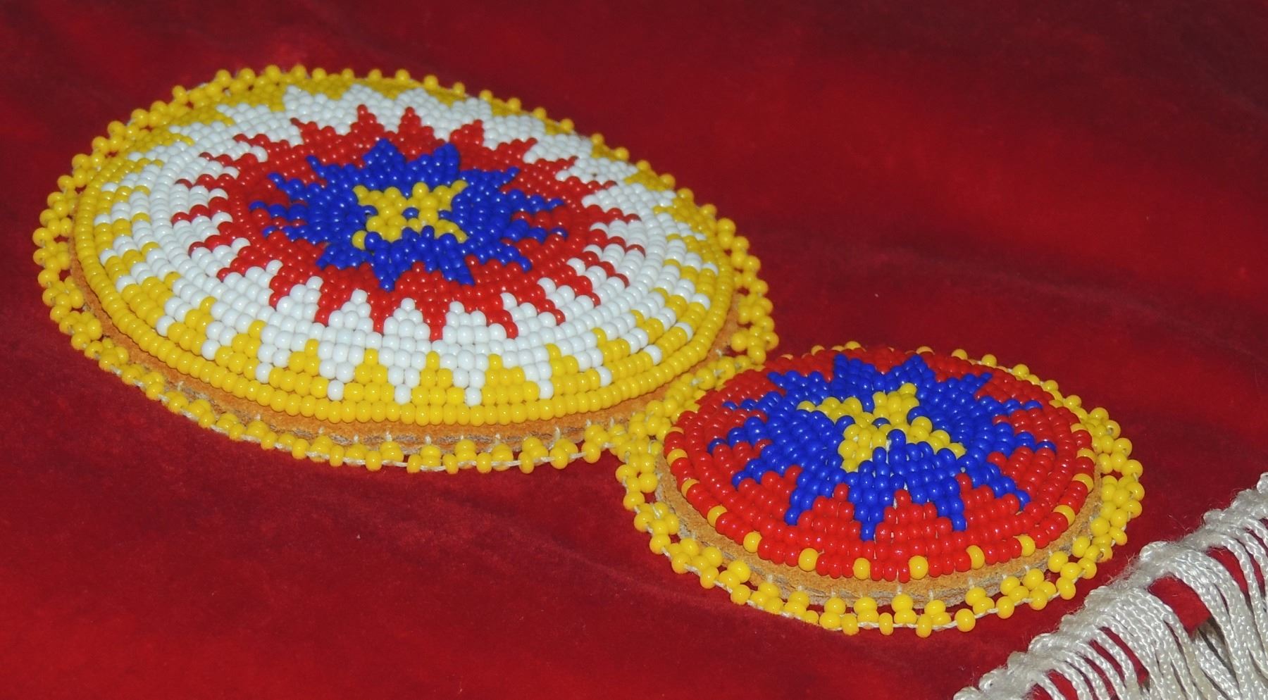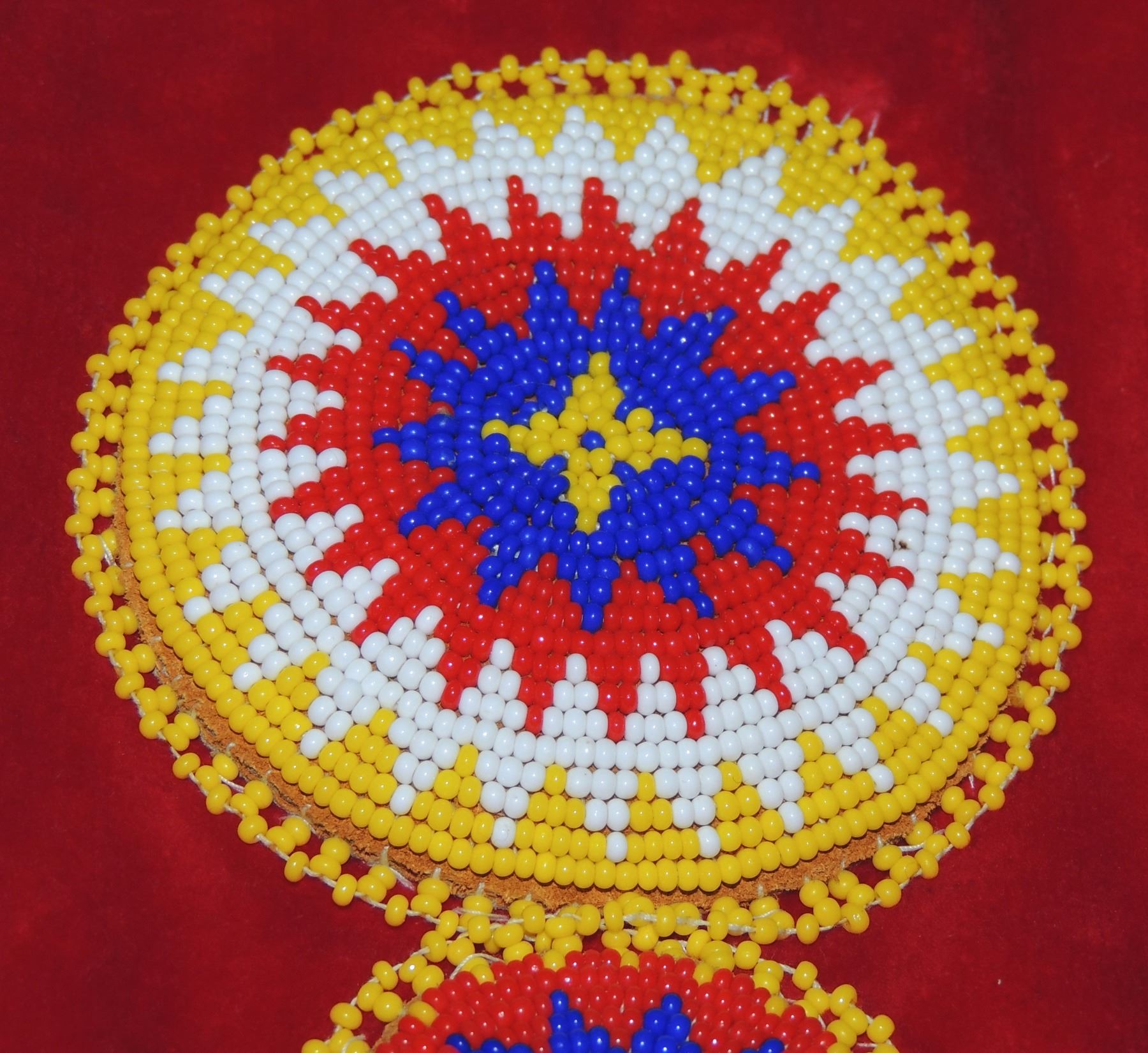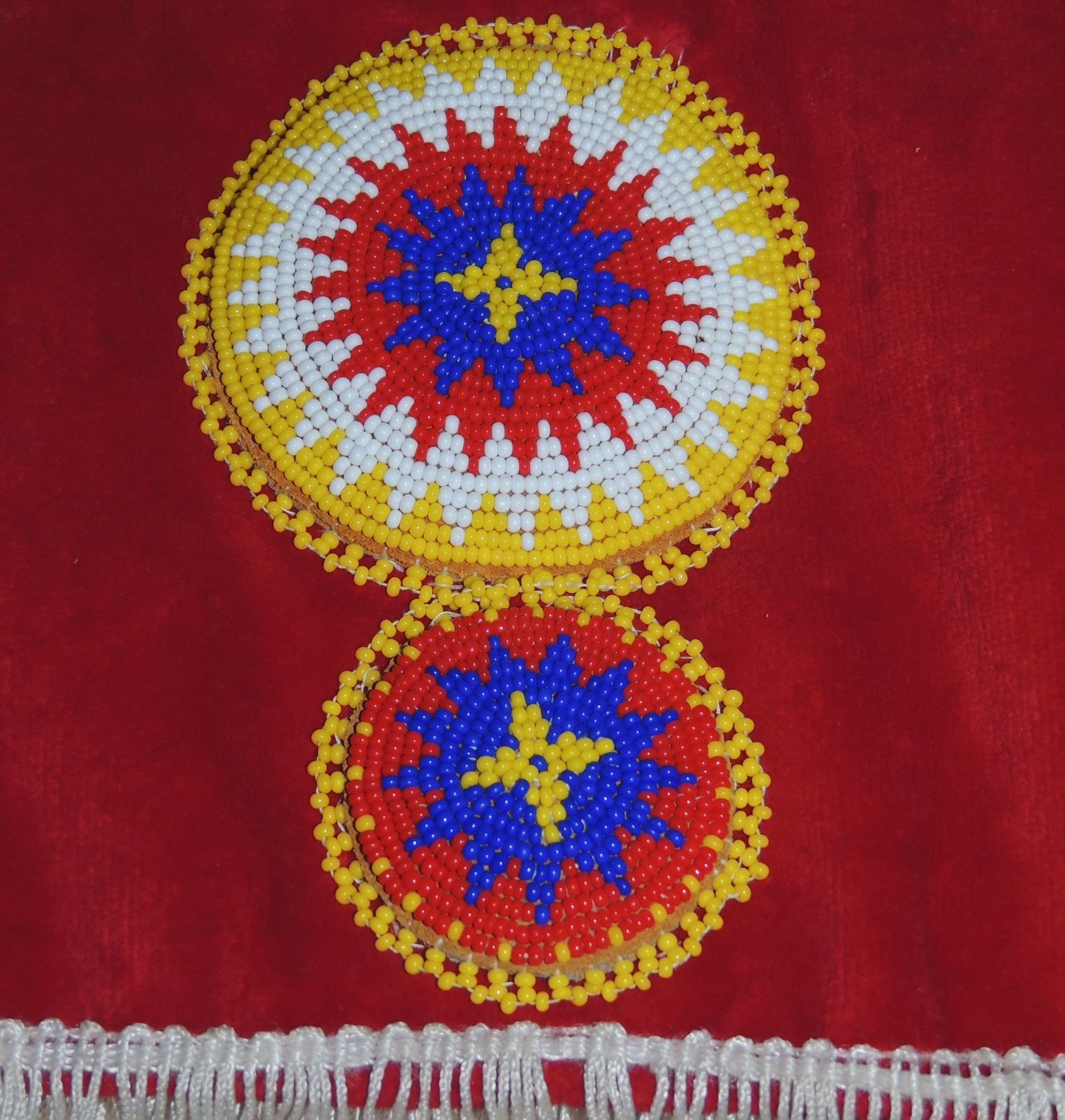 Appears Early 20th Century, with Ornate Circular Beadwork on Front and Reverse. Shawl Measures 13 Inches Wide, 10.5 Inches long at tallest, and 7 inches at shortest- Neck Hole is 8.5 Inches by 7 Inches. Western Cloth used for Interior with square patterns. Please see our Other Auctions for additional - First Nations -Aboriginal -Indigenous Peoples- Metis - Iniut - Native American - Plains Indian - Artefacts