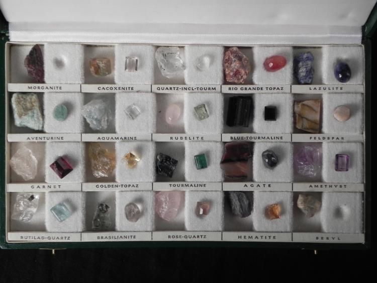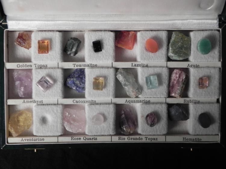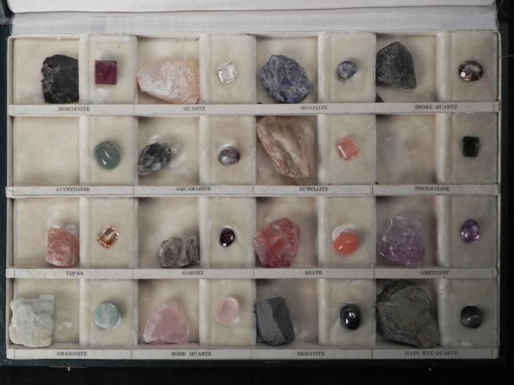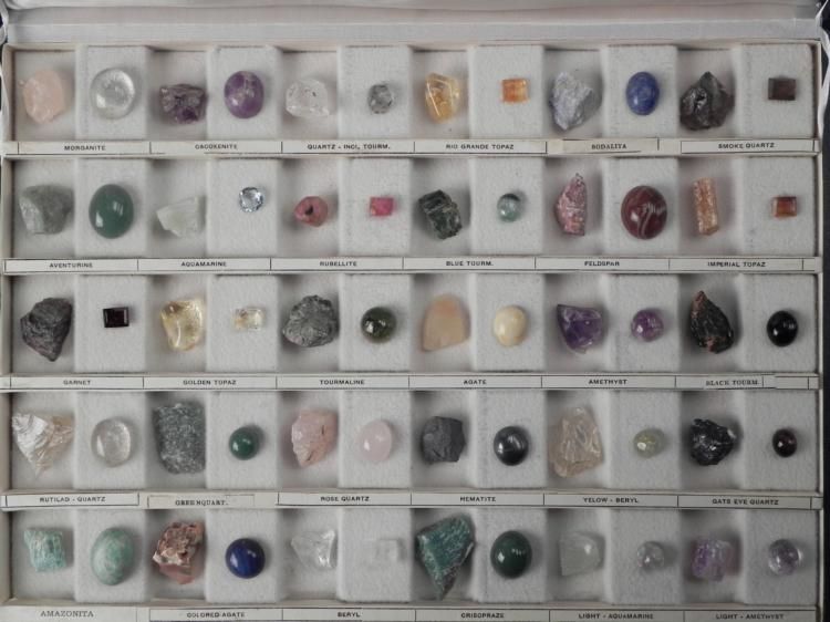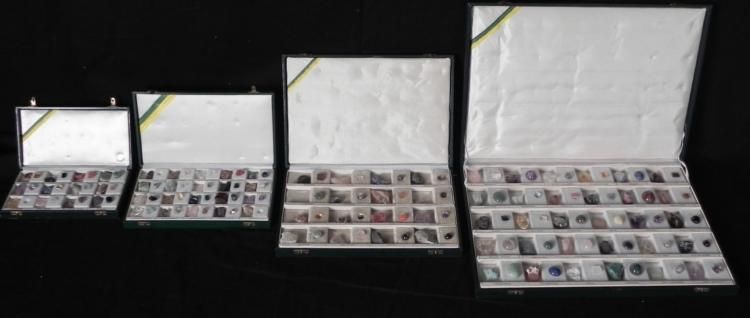 Included here are four gemstone identification sets, with a great variety of stones. These sets are used by gemologists and collectors alike. Each gem features a polished version, and one in matrix, allowing you to see what the gem looks like in its natural state as well. There are approximately 156 pieces in all, with a couple stones missing. There are more different stones than we can even mention here, but some include: quartz, agate, amethyst, tourmaline, amazonita, sodalita, garnet, feldspar, and more. Each is identified with a label, and set in individual compartments. Each case is hinged, with metal closures. They are in excellent condition overall. * Whether you're a novice gemstone collector, or expert jeweler, these sets are both useful to have, and beautiful to see.