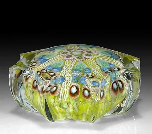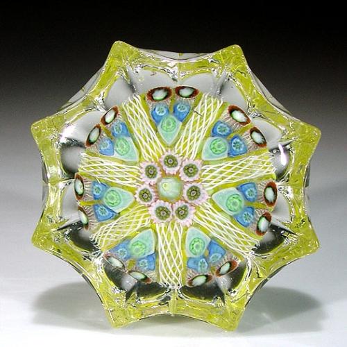 Strathearn pressed, eight-point, star-shaped, flat paperweight, containing a central ring of millefiori and radiating latticinio twists, alternating with sections of pale blue, green, and brown canes, over pale yellow ground. Diameter 3 1/8". NO RESERVE