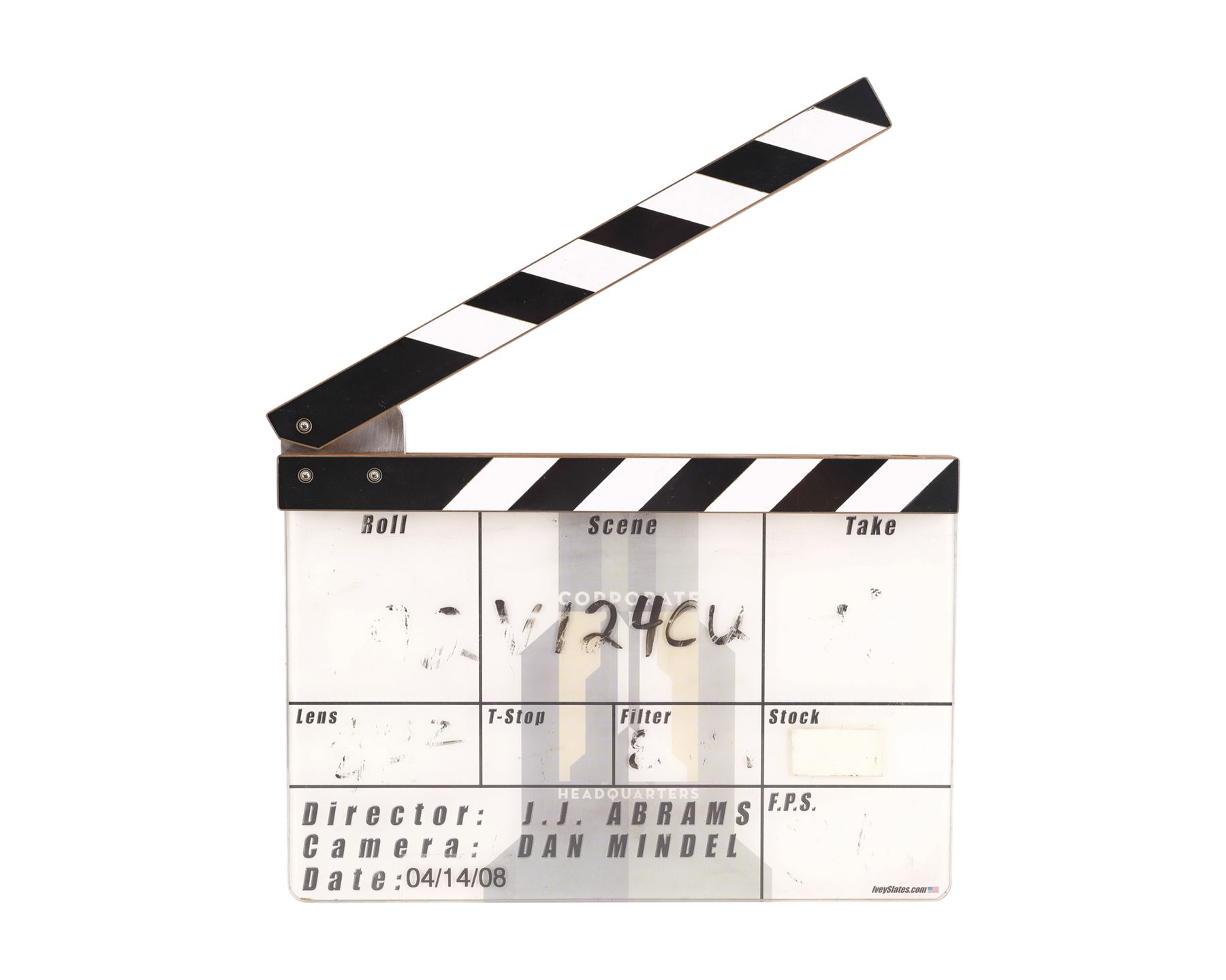 STAR TREK (2009) - Clapperboard - A clapperboard from the production of J.J. Abrams' Star Trek. This acrylic clapperboard with a striped brown and white wooden slate is printed with the names of director Abrams and cameraperson Dan Mindel, applied with a sticker label dated "04/14/08", and features scene numbered "V124CU" hand-marked in black marker. It exhibits white adhesive tape over the "Stock" section and black self-adhesive tape on the back. The clapperboard exhibits discoloration and faded text to previous markings in the "Roll," "Take," "Lens," and "Filter" sections. Dimensions: 13" x 10" x 1" (33 cm x 25.5 cm x 2.5 cm)