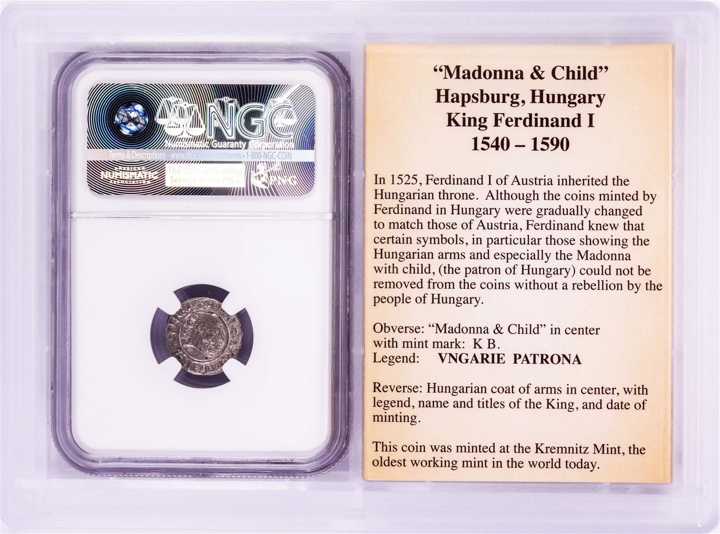 One 1560 KB Hungary Denar 'Madonna and Child' Coin NGC XF45 w/ Story Box. NGC Certified.