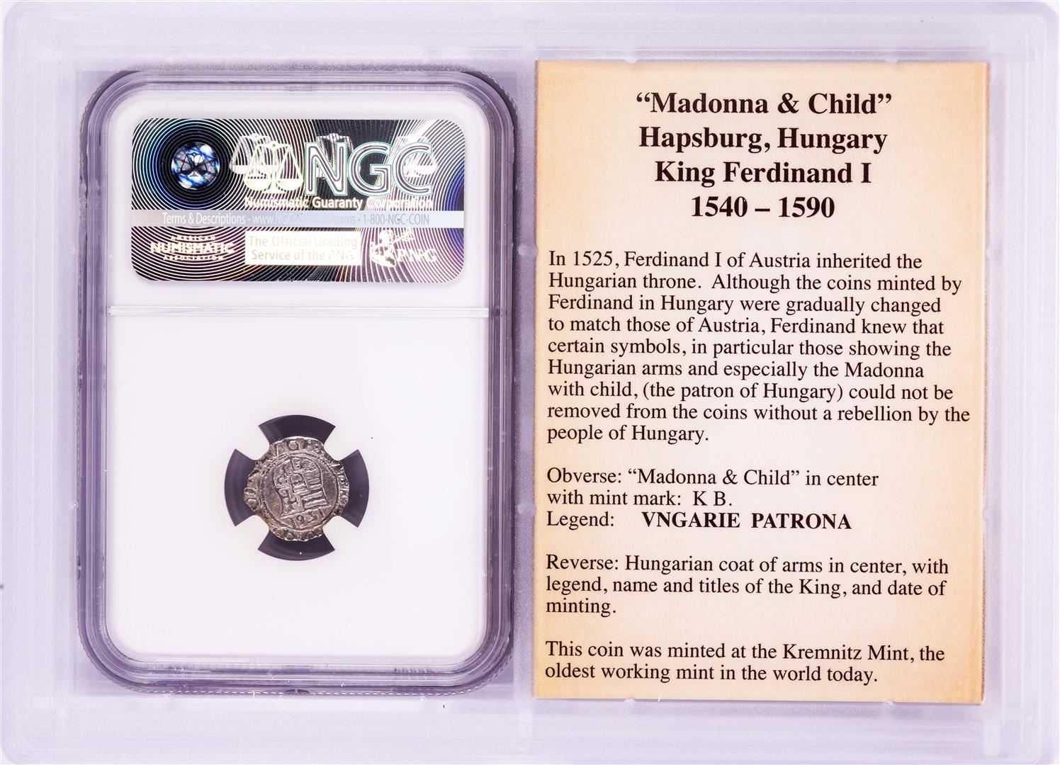 One 1561 KB Hungary Denar 'Madonna and Child' Coin NGC XF45 w/ Story Box. NGC Certified.