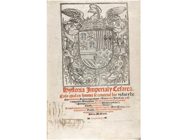 1564., LIBRO: (HISTORIA-EMPERADORES ROMANOS),. MEXIA, PERO:, HYSTORIA IMPERIAL Y CESAREA. En la qual en summa se contiene las vidas y hechos de todos los cesares emperadores de Roma: desde Julio Cesar hasta Maximiliano., Sevilla: Sebastian Trugillo, 1564. 4º Mayor. Frontis con grabado xilográfico del escudo de España y a dos tintas, 6 h. + CCCXXXIII fol. Texto en letra gótica, a dos columnas, con apostillas marginales. Bustos xiolgráficos de los césares biografiados, colofón (en el que consta el impresor). Enc. en plena holandesa, nervios, tejuelo, cortes pintados. Anotaciones a lápiz de anterior poseedor en las guardas y el frontis. Algunos pliegos con el papel oscurecido que lo torna quebradizo. Frontis y primera hoja restauradas en el margen, con pequeña pérdida de texto. Cerco de humedad en la última hoja, que rodea el grabado xilográfico del colofón (restaurado). Palau 167345.