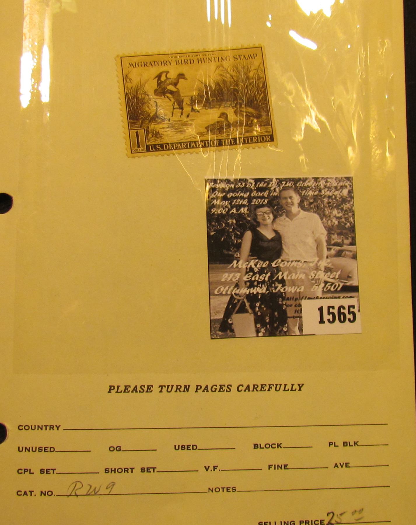 1565 . 1942 RW9 U.S. Department of the Interior Federal Migratory Waterfowl Stamp. Signed.