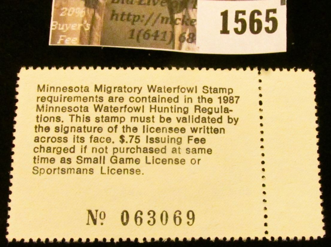 1565 . 1987 Minnesota Migratory Waterfowl $5 Stamp, full tab. Depic