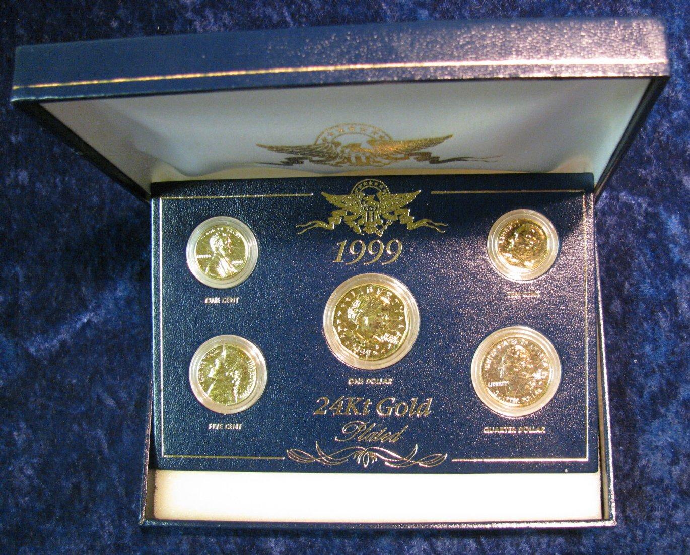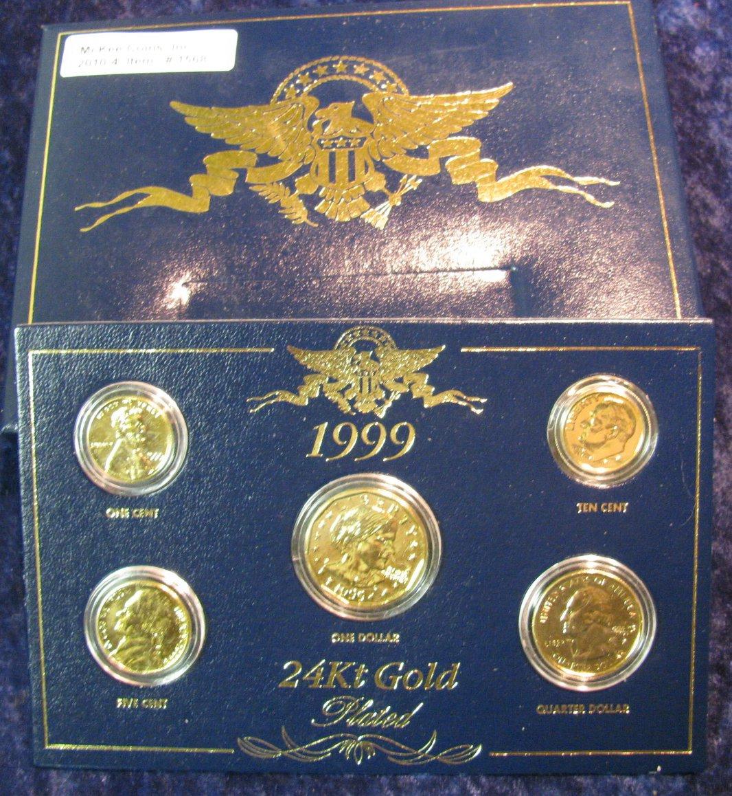 1568. 1999 24K Gold-plated Set of Coins Cent, Nickel, Dime, Quarter, & Dollar in a fancy box. Originally issued at $49.95.